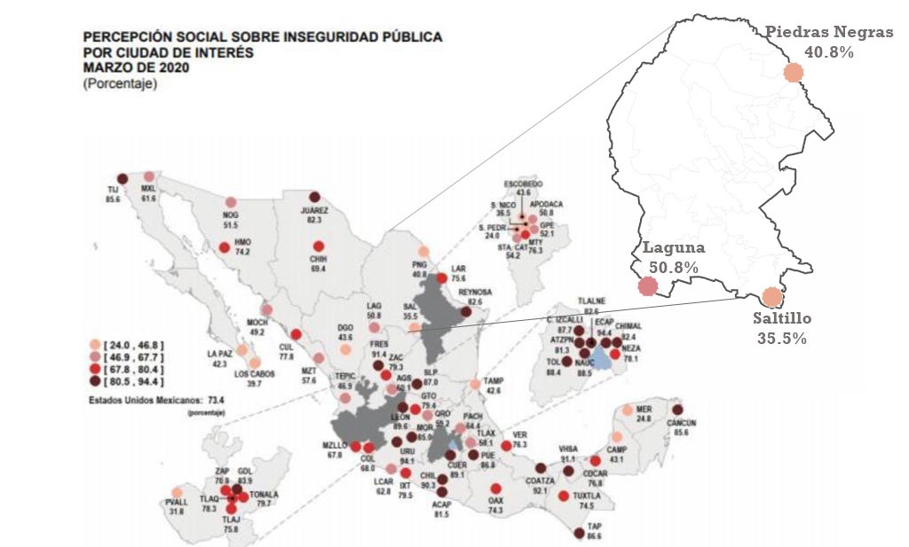 Saltillo es considerada la cuarta ciudad donde la percepción de inseguridad es menor, con un porcentaje del 35.5%. Por su parte, la Región Laguna se encuentra en la posición 16 a nivel nacional, con un porcentaje de 50.8%