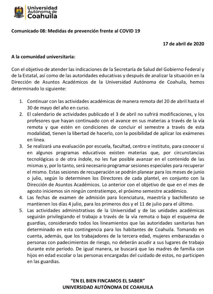 A través de un comunicado, la Universidad Autónoma de Coahuila explicó que se analizó la situación con la Dirección de Asuntos Académicos, por lo que se determinó que el calendario de actividades que se publicó el pasado 3 de abril no será modificado.