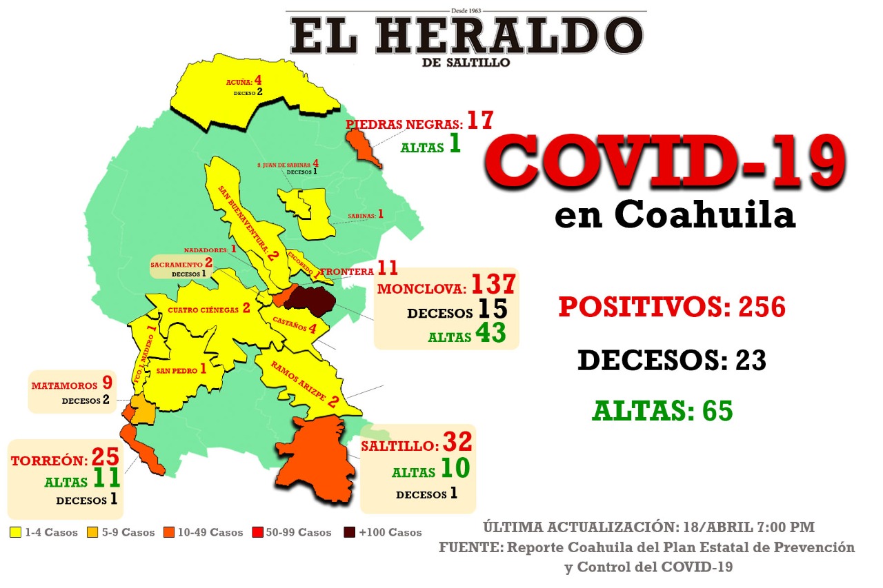 Al corte, se contabilizan en Coahuila en total 256 -incluidos 23 decesos- distribuidos de la siguiente manera:
