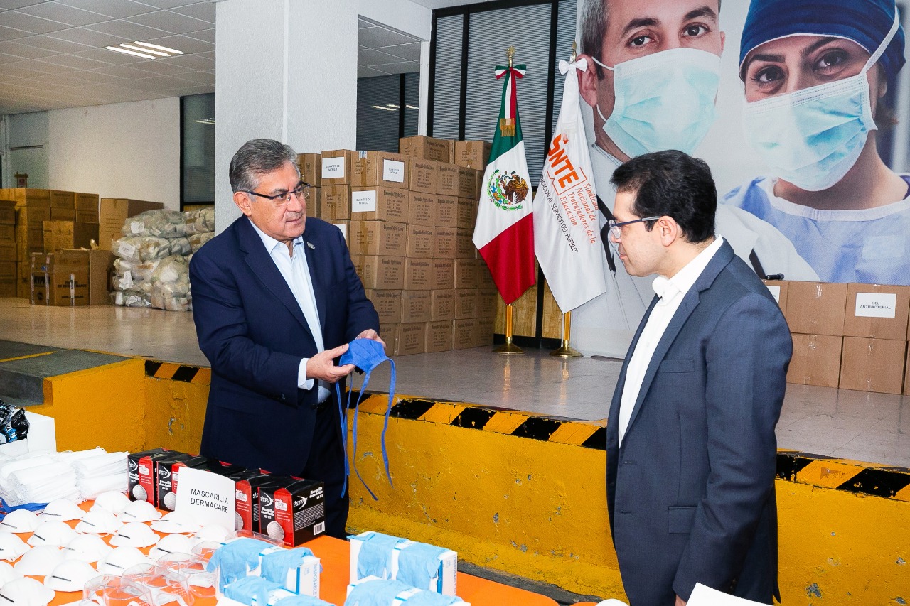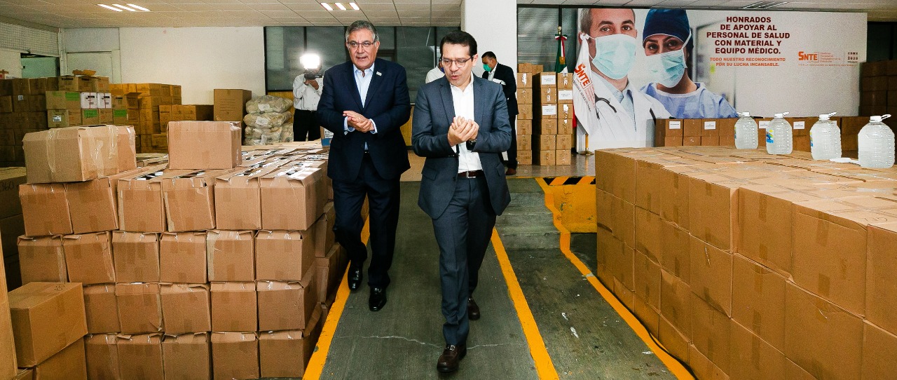 En la sede nacional del SNTE, el secretario general del Sindicato entregó, de manera simbólica, al director general del Instituto de Seguridad y Servicios Sociales de los Trabajadores del Estado (ISSSTE), Luis Antonio Ramírez Pineda, 10 mil monogogles, 350 mil cubrebocas, 10 mil mascarillas de protección, 400 mil guantes, 200 mil cofias, 10 mil batas quirúrgicas y 9 mil 500 litros de gel antibacterial, material que será trasladado por la organización gremial a 37 hospitales Covid del Instituto, en diferentes estados del país.