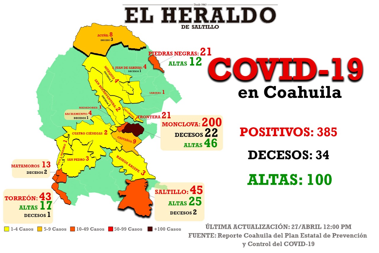 Hasta este lunes se contabilizan en Coahuila en total 385 casos -incluidos 34 decesos y 100 altas- distribuidos de la siguiente manera: