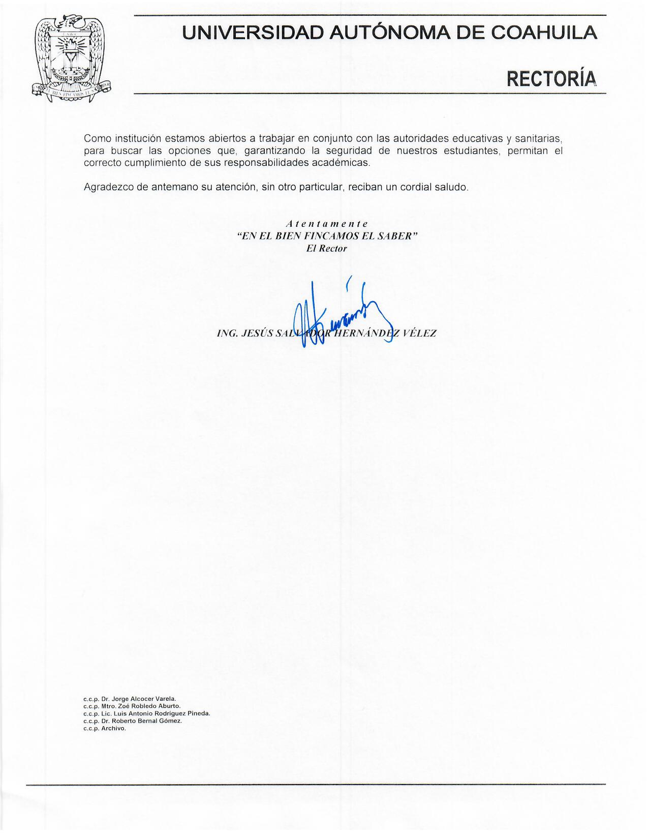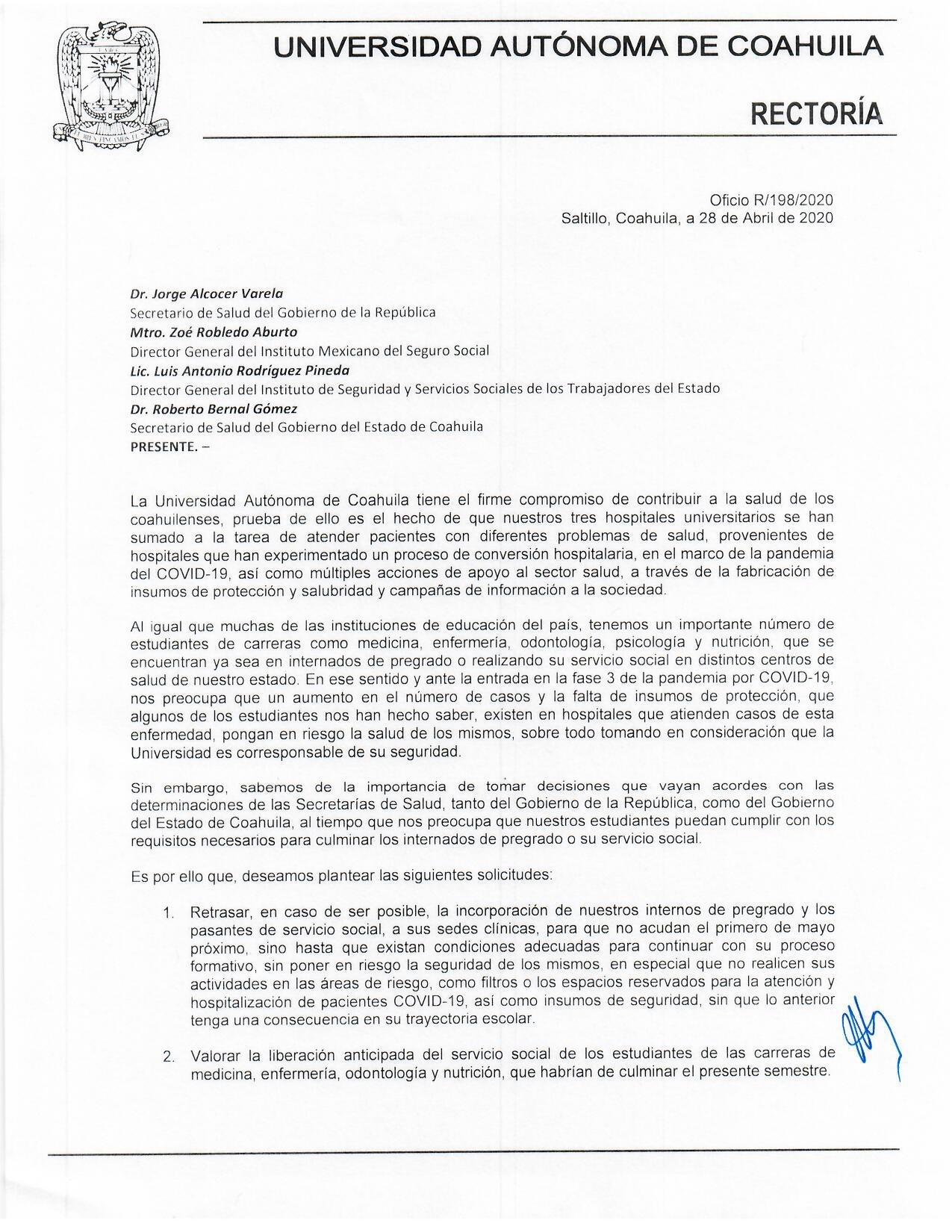 La Universidad Autónoma de Coahuila solicitó a la Secretaría de Salud Federal y Estatal; al Instituto Mexicano del Seguro Social (IMSS) y al Instituto de Seguridad y Servicios Sociales de los Trabajadores del Estado (ISSSTE) retrasar, en caso de ser posible, la incorporación de sus internos de pregrado y pasantes de servicio social a sus sedes clínicas hasta que existan condiciones adecuadas para continuar con su proceso formativo, sin poner en riesgo la seguridad de los mismos.