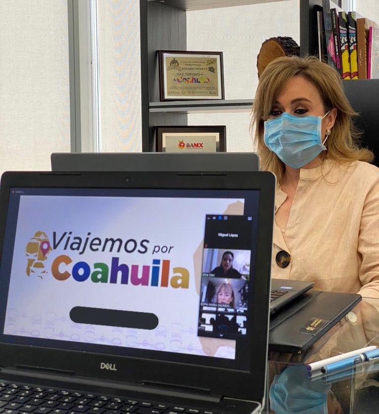 En su despacho, la titular de SECTUR Coahuila participó, de manera virtual, en la reunión mensual de AFEET, a cargo de Dora María Galindo, y en la que se revisaron propuestas diversas para la reactivación del turismo en la entidad una vez que se levante la contingencia sanitaria por el COVID-19.