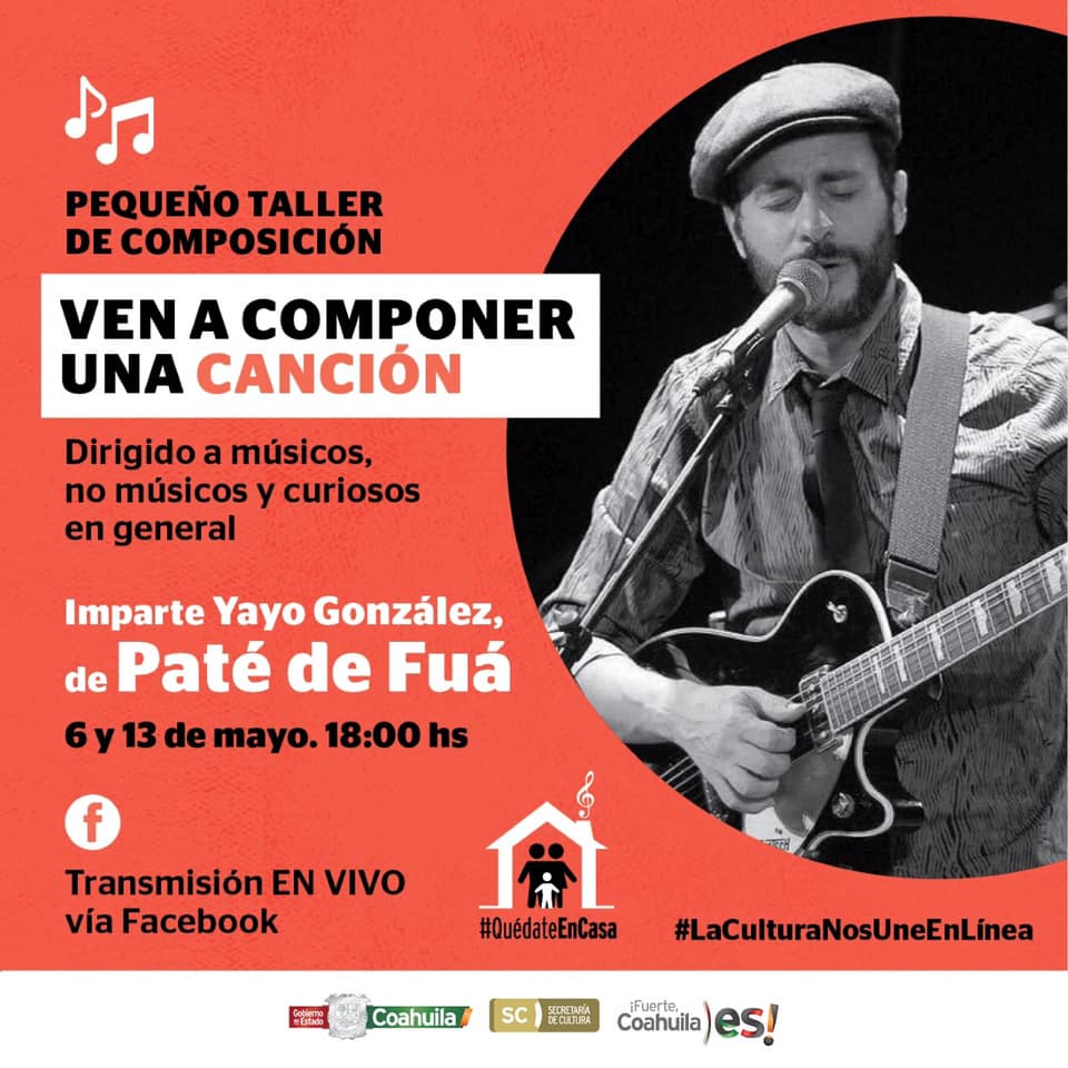Yayo González, compositor y vocalista de la agrupación Paté de Fuá, cuyo sonido conjunta géneros como el tango y el jazz, ofrecerá a través de la página de Facebook de la Secretaría de Cultura de Coahuila un «Pequeño Taller de Composición. Ven a Componer una Canción», los próximos 6 y 13 de mayo a las 6:00 de la tarde.