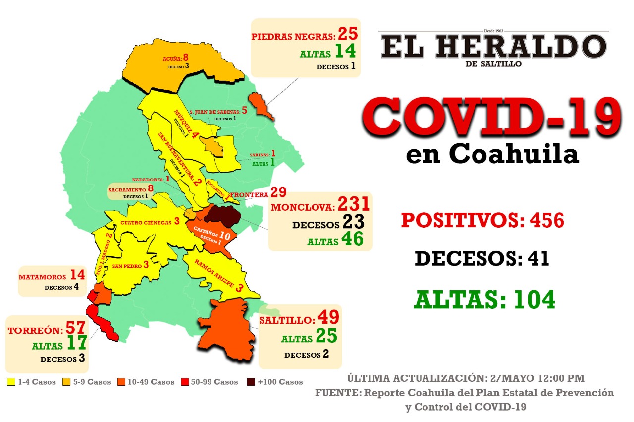 Con estos se contabilizan en Coahuila en total 456 casos -incluidos 41 decesos- distribuidos de la siguiente manera: