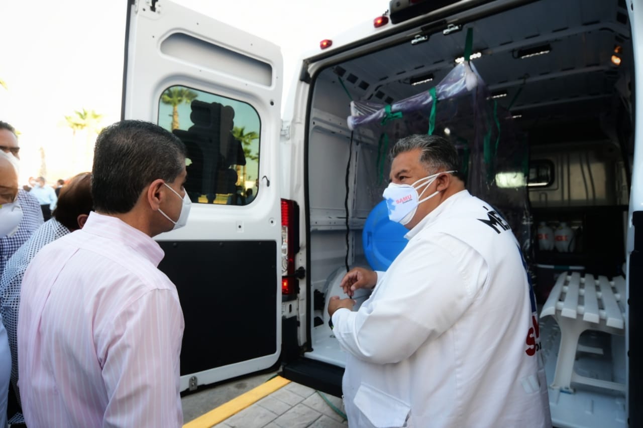 Riquelme Solís entregó al personal de este nosocomio una ambulancia especializada COVID-19, un módulo de atención y diagnóstico Triage y el Laboratorio de Biología Molecular para realizar pruebas de detección.