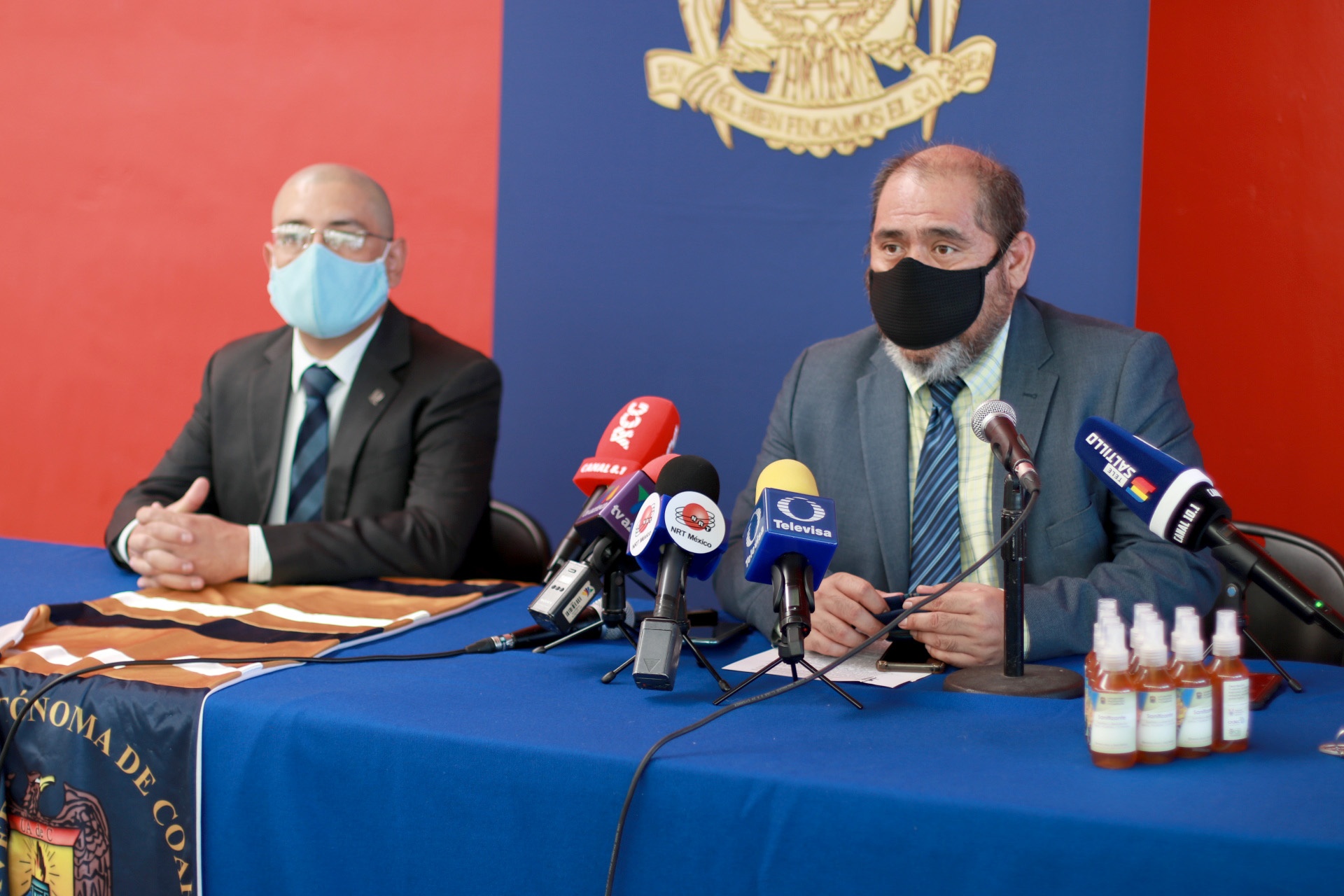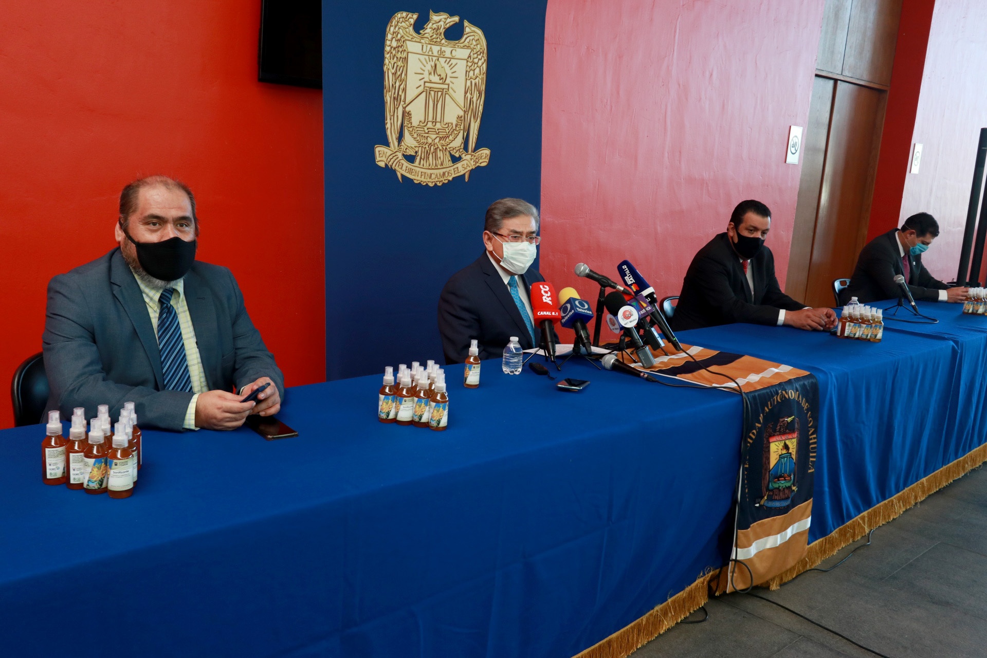 En rueda de prensa, el rector de la máxima casa de estudios, Salvador Hernández Vélez, acompañado del secretario general, Miguel Ángel Rodríguez Calderón, el director de Asuntos Académicos, Octavio Pimentel Martínez, el director de Investigación y Posgrado, Cristóbal Noé Aguilar y el subdirector administrativo, José Sandoval Cortés, dieron a conocer los detalles sobre la elaboración del sanitizante.