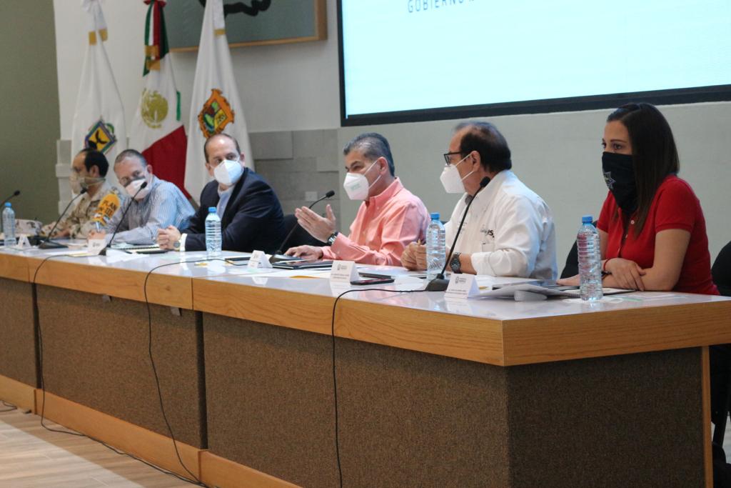 Miguel Riquelme estuvo acompañado por el Secretario de Salud del Estado, Roberto Bernal Gómez; Sonia Villarreal Pérez, Secretaria de Seguridad Pública, y Francisco Saracho Navarro, Secretario de Inclusión y Desarrollo Social, quien expuso que durante la sesión anterior se acordó establecer filtros sanitarios más estrictos, con total respeto a los derechos humanos, así como la prohibición de los festejos alusivos al mes de mayo y las visitas a los panteones.