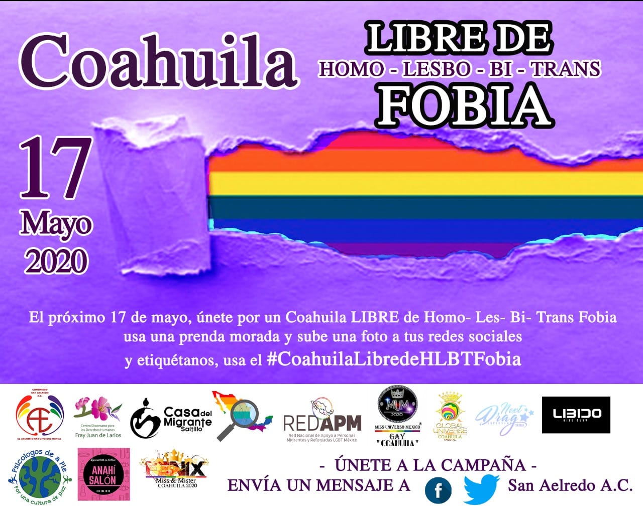 La Comunidad San Aelredo Asociación Civil, invitó a la ciudadanía por medio de un comunicado a unirse a la celebración del Día Internacional de la Lucha contra la Homofobia, a celebrarse el próximo 17 de mayo con la campaña «Coahuila Libre de Homo-Lesbo-Bi-Trans-Fobia». La dinámica consiste en tomarse una fotografía tipo selfie portando alguna prenda o accesorio morado y subirla a redes sociales, etiquetando a esta organización y utilizando el hashtag #CoahuilaLibredeHLBTFobia, en reconocimiento a esta causa.
