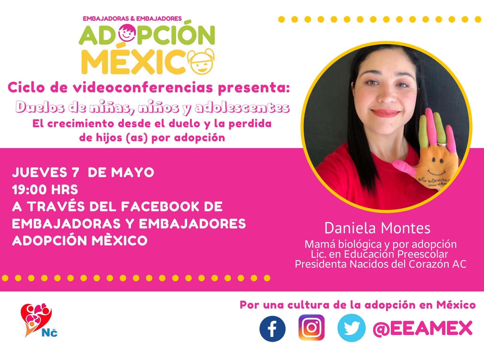 La organización «Embajadoras y Embajadores Adopción México» presentará este jueves a las 7:00 de la tarde, a través de su página de Facebook, la videoconferencia «Duelos de Niñas, Niños y Adolescentes», que será impartida por la licenciada en Educación Preescolar, Daniela Montes.