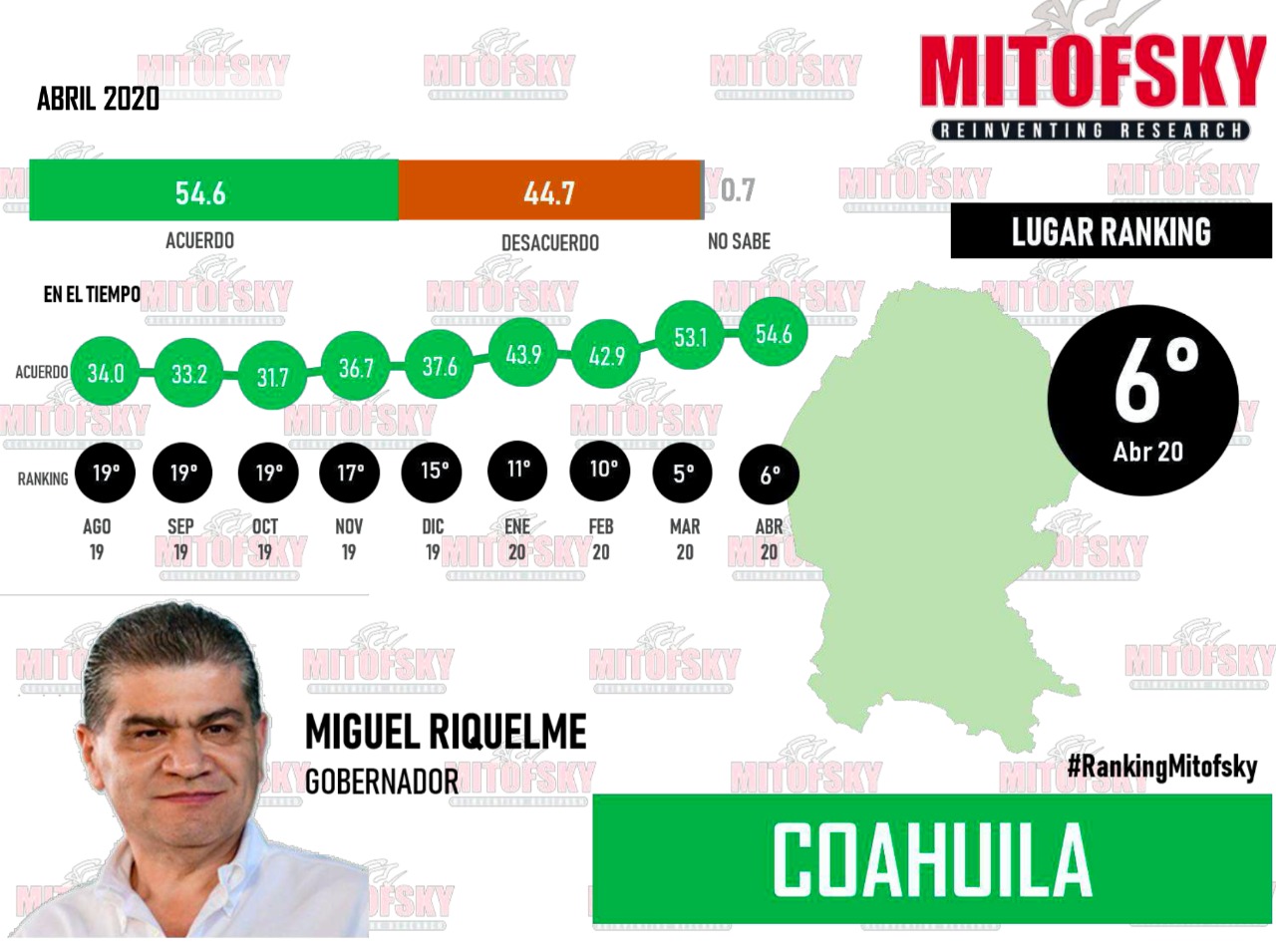 El nivel de aprobación que los ciudadanos de Coahuila le dan al gobernador Miguel Ángel Riquelme se mantiene a la alza, acumulando tres meses consecutivos de crecimiento y alcanzando ya un 54.6% de coahuilenses que manifiestan estar de acuerdo con sus acciones de gobierno. Miguel Riquelme es el sexto gobernador mejor evaluado del país, y el segundo entre todos los emanados del PRI. Su aprobación, de acuerdo con el estudio que mes a mes presenta Consulta Mitofsky, se encuentra cinco puntos por encima de la del presidente López Obrador, la cual se ubica en un 49%. Además, desde agosto de 2019 a abril de 2020, la aprobación del gobierno de Miguel Riquelme ha crecido en más de 20 puntos porcentuales. (EL HERALDO DE SALTILLO)