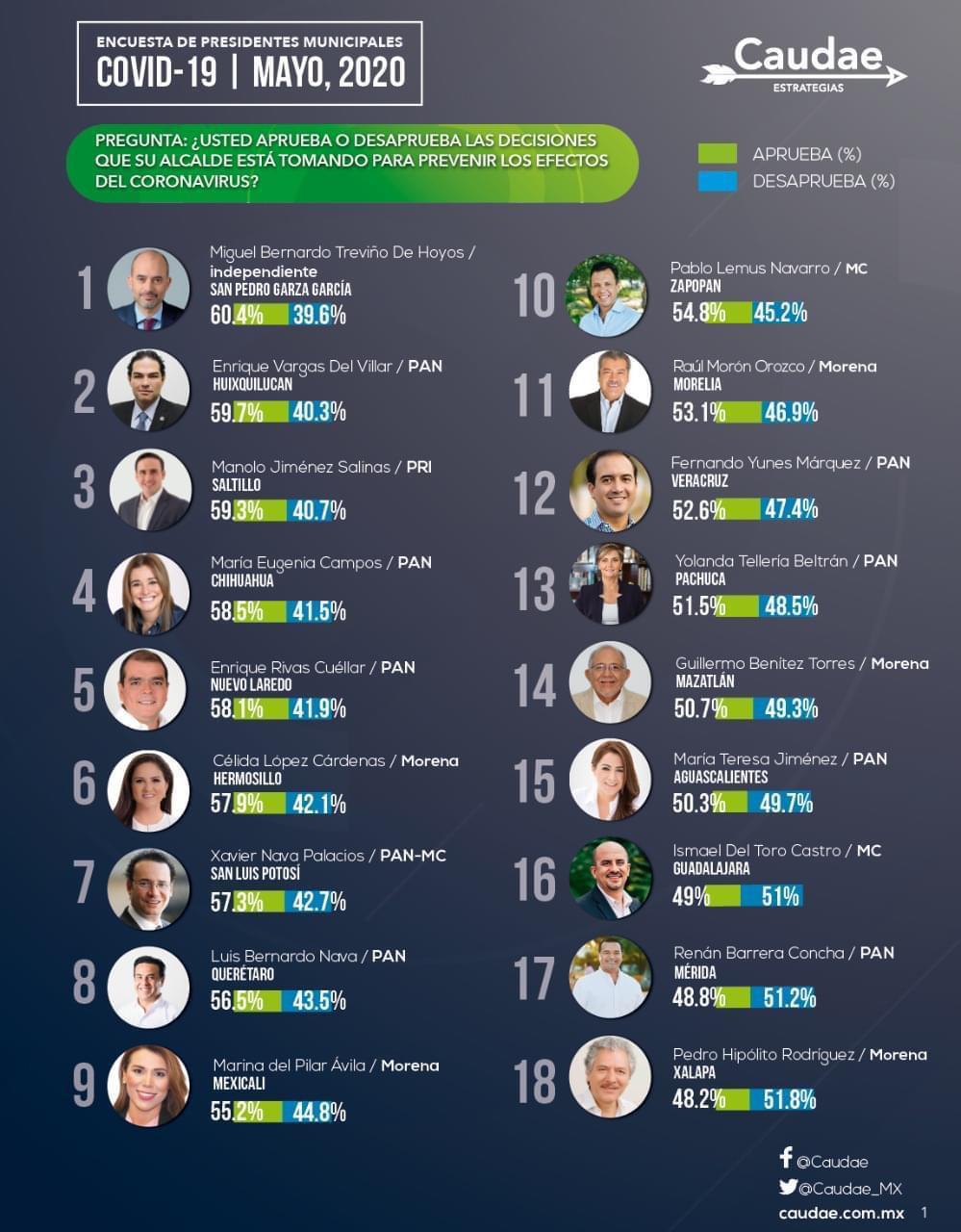 El estudio coloca al munícipe saltillense en el tercer lugar de dicha lista con un 59.3 por ciento de aprobación de su gente, solamente por debajo del alcalde de Huixquilucan, Enrique Vargas, y el de San Pedro Garza García, Miguel Bernardo Treviño, quien encabeza la lista con un 60.4 por ciento de aprobación.