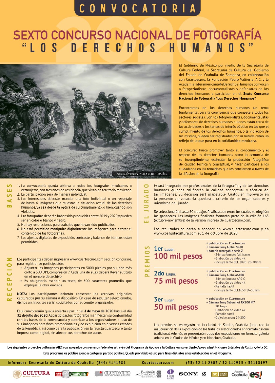 Los Gobiernos Federal y Estatal, a través de sus Secretarías de Cultura y en colaboración con Cuartoscuro, la Fundación Pedro Valtierra AC y la Academia Interamericana de Derechos Humanos, convocan a fotoperiodistas, documentalistas y defensores de los Derechos Humanos a participar en el Sexto Concurso Nacional de Fotografía de “Los Derechos Humanos”.