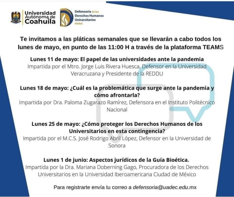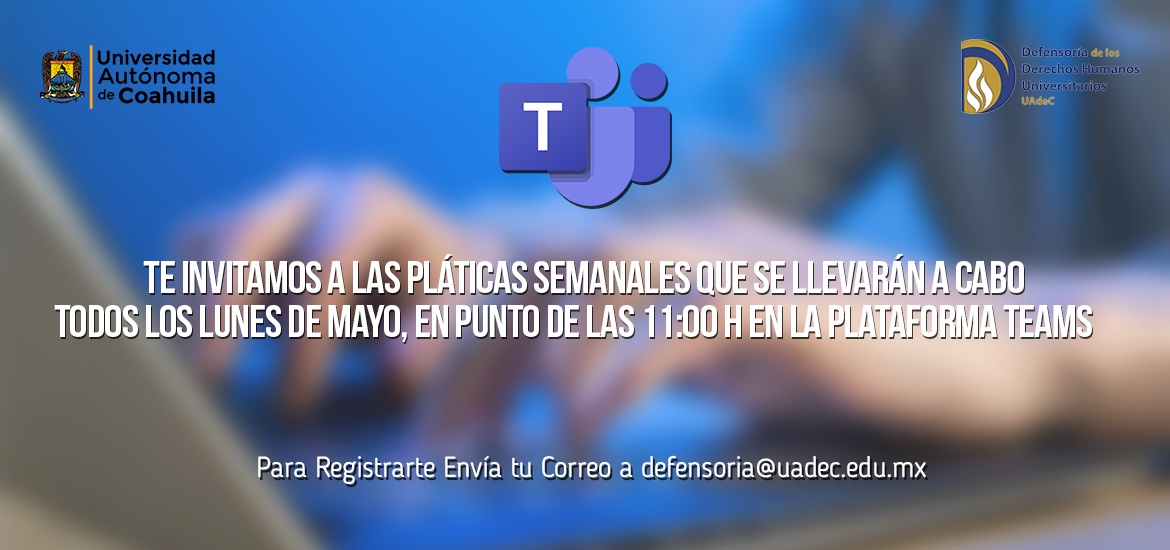 La Universidad Autónoma de Coahuila, en coordinación con la Defensoría de los Derechos Humanos Universitarios, extiende la invitación a participar en las pláticas semanales que se llevarán a cabo a través de la plataforma digital TEAMS para atender e informar a la comunidad universitaria durante la pandemia que se vive actualmente a causa del Covid-19.