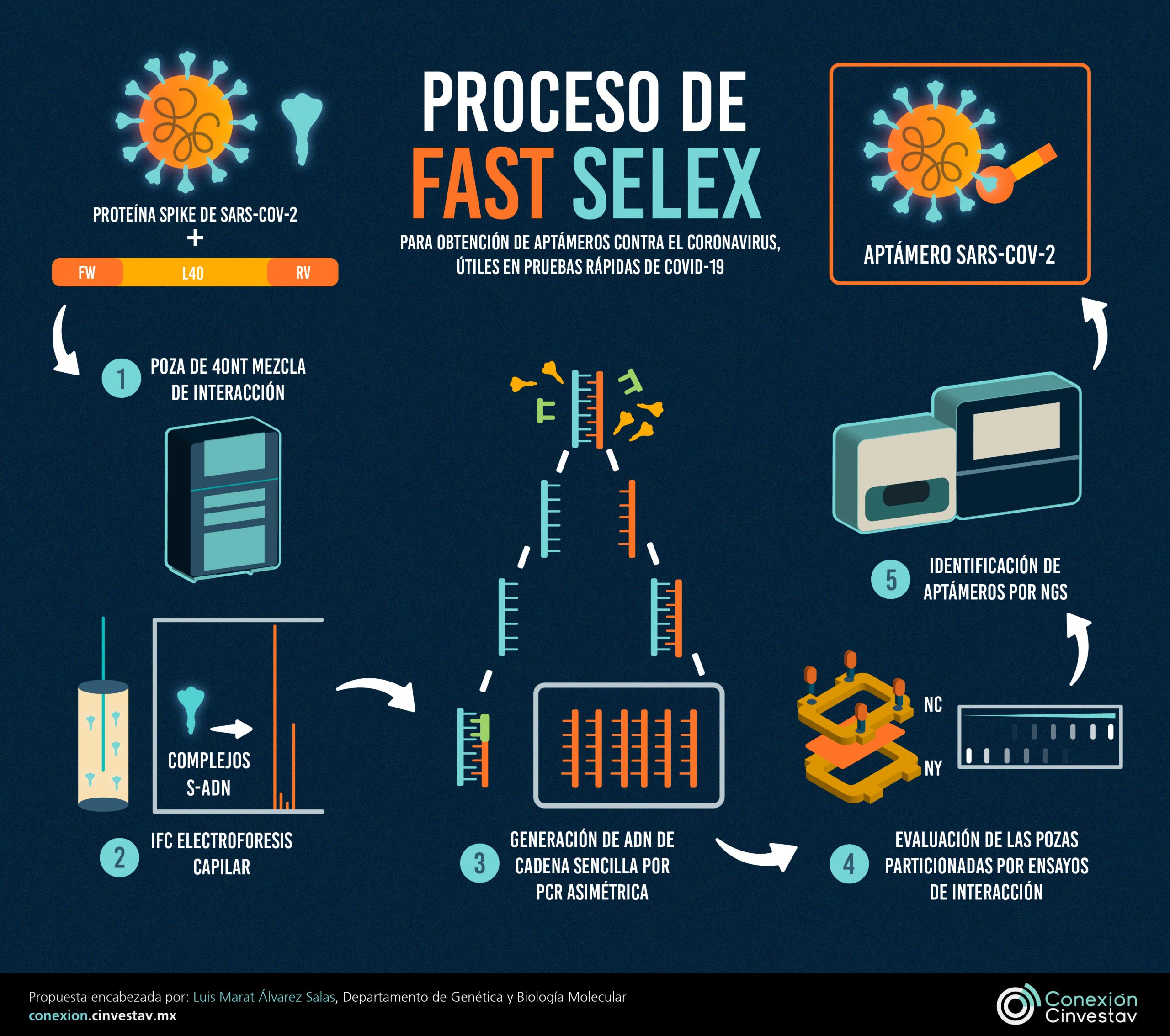 Los aptámeros son pequeñas moléculas de ADN o ARN sintetizadas químicamente mediante el método Selex, que mimetiza el proceso de selección natural en pozas de oligonucleótidos de cadena sencilla donde se incuba el elemento particular con que se desea que el aptámero tenga afinidad, como puede ser una célula o, el caso particular la proteína Spike (S) del SARS-CoV-2.