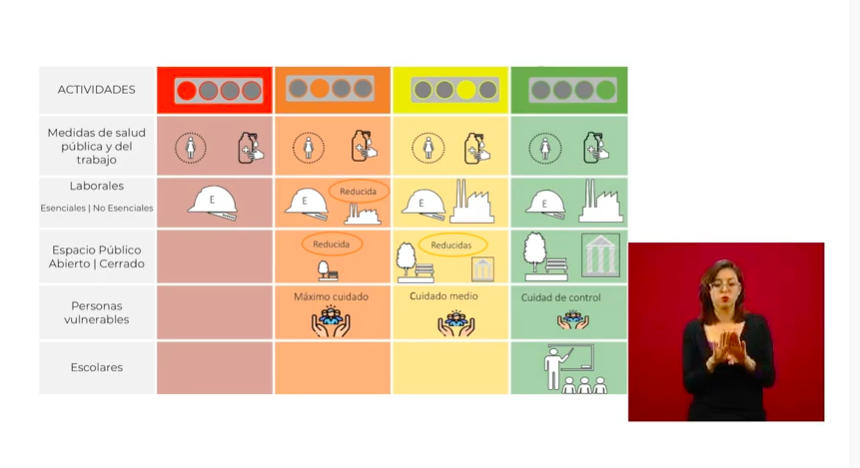 • Naranja: además de las actividades esenciales, se abrirán también los espacios públicos abiertos, pero con una cantidad reducida de personas y teniendo medidas de cuidado de máximo cuidado para grupos vulnerables.