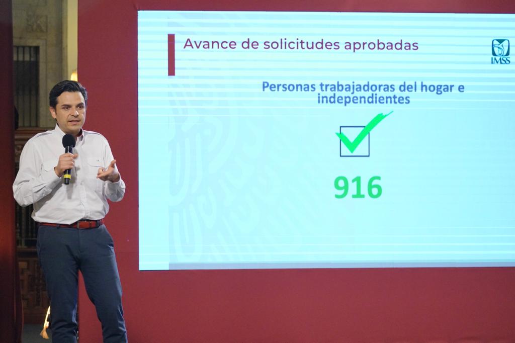 En otro tema, dijo que 916 personas trabajadoras del hogar e independientes que están afiliadas al Instituto han solicitado un Crédito Solidario a la Palabra. Desde el 13 de mayo estos sectores pueden acceder a la plataforma digital www.imss.gob.mx para solicitarlo.