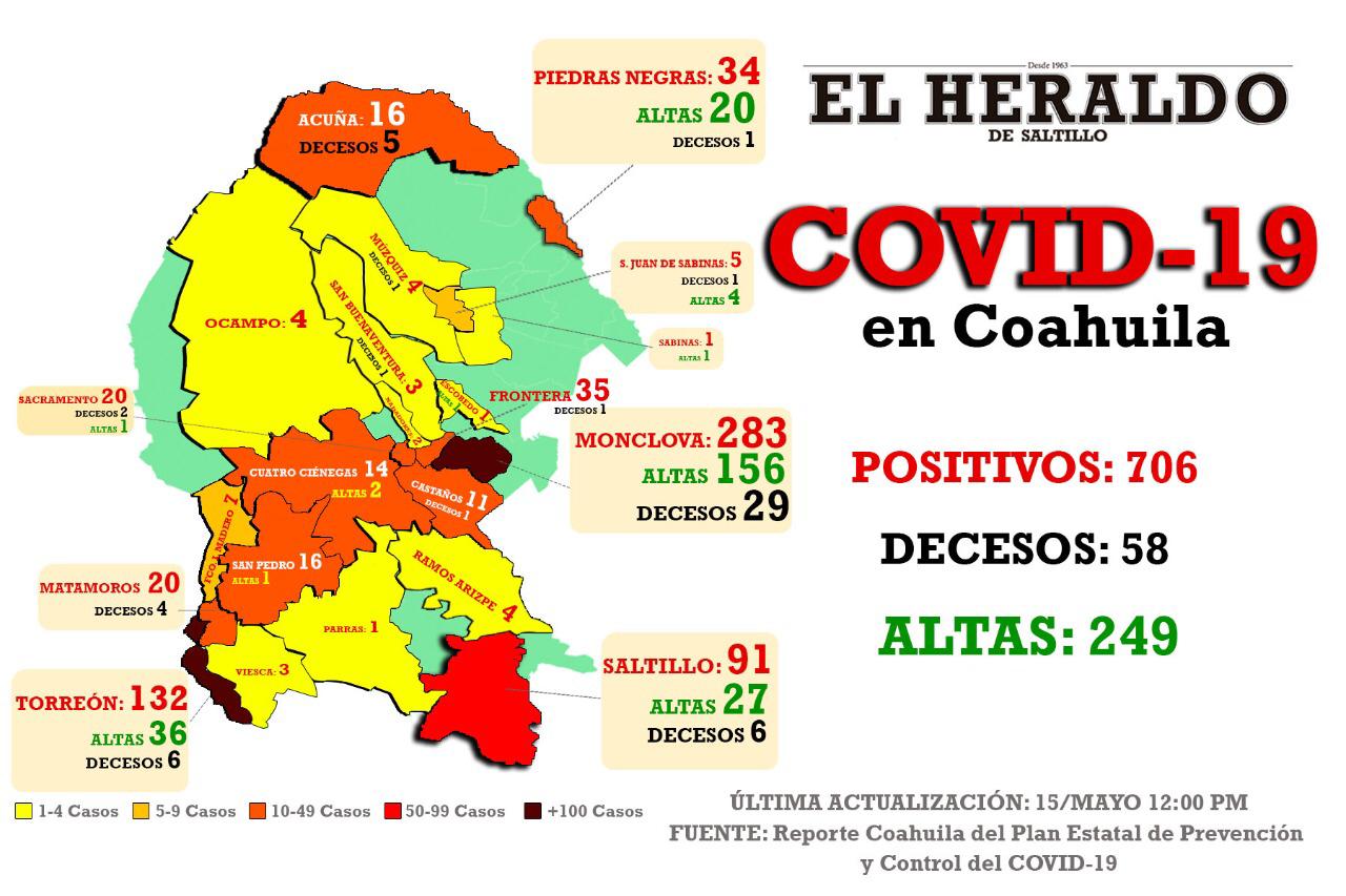 Se contabilizan en Coahuila en total 706 casos incluidos 58 decesos – distribuidos de la siguiente manera: