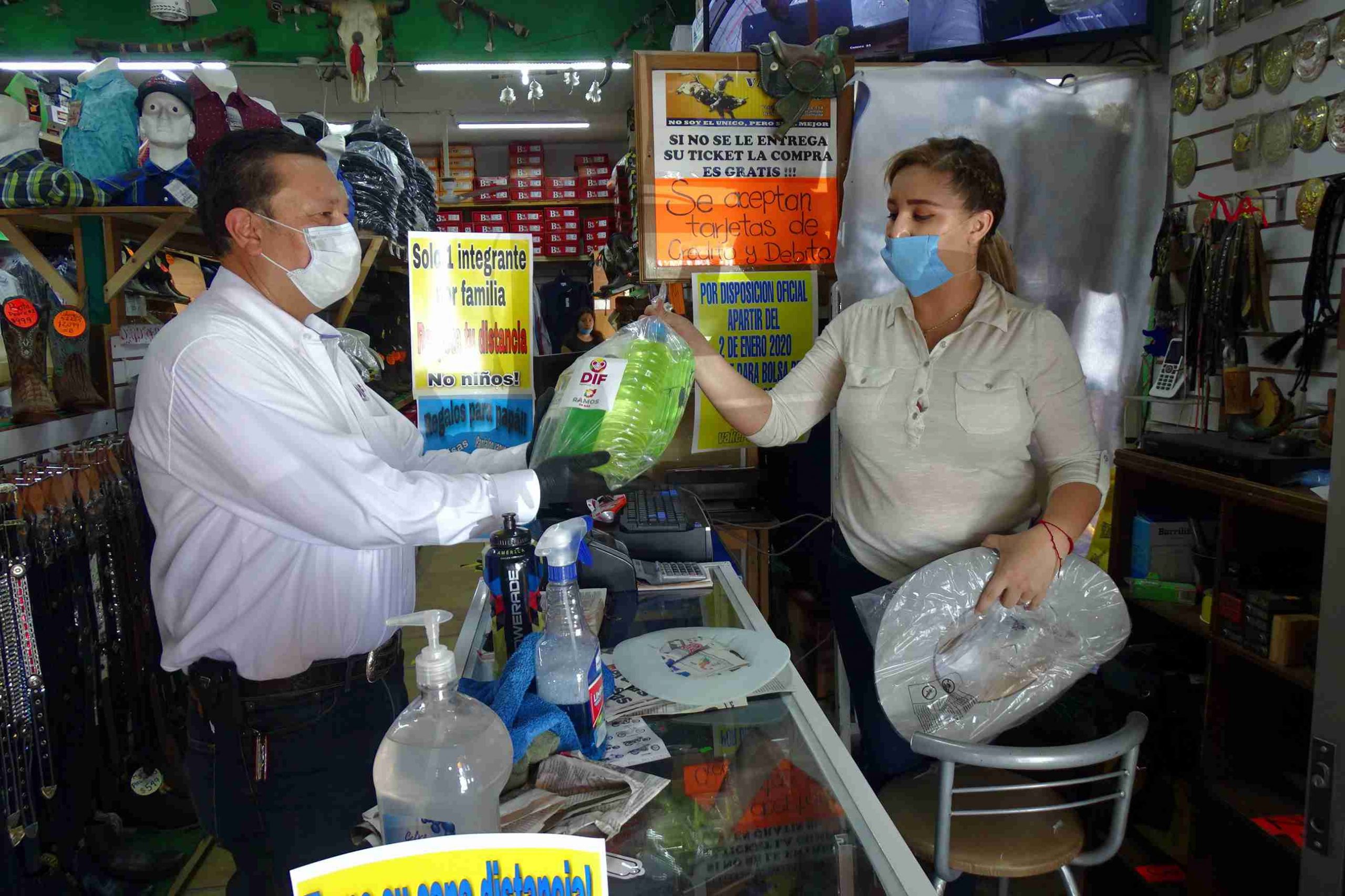 “Acudimos este lunes por la instrucción de nuestro alcalde Chema Morales Padilla y de su señora esposa, nuestra presidenta Anilú Cavazos a los comercios ubicados en la zona centro de Ramos Arizpe para entregar 150 kits de limpieza para los negocios, los cuales incluyen cloro, gel antibacterial, jabón líquido para manos, cubre bocas y guantes de látex con la finalidad de que tengan cubierta la parte higiénica que ha puesto como disposición el comité estatal Covid para la reapertura de negocios” manifestó Jorge Gutiérrez Padilla, presidente del DIF municipal.