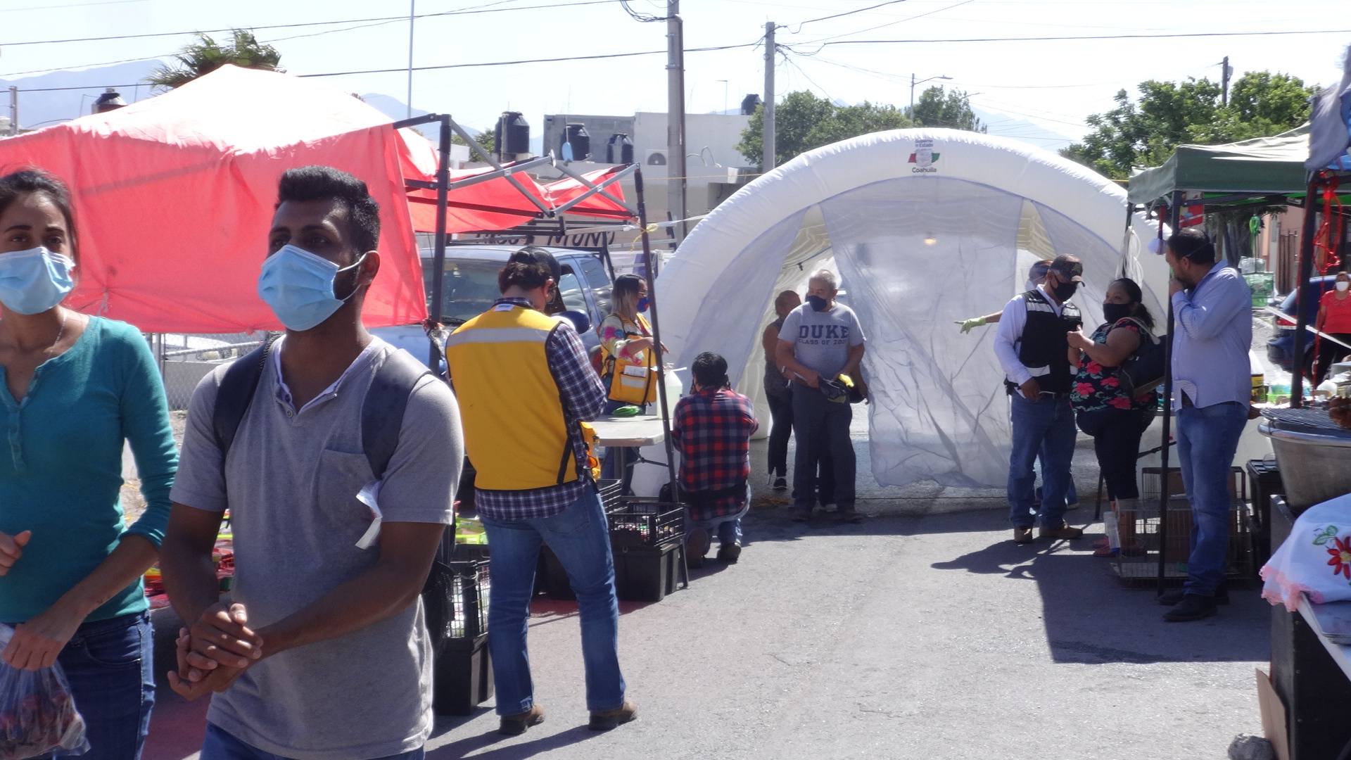 Túneles sanitizantes, medición de temperatura, aplicación de gel antibacterial, uso obligatorio de cubrebocas y reducción de puestos, son parte de las medidas preventivas contra el Covid-19 que este martes se aplicaron en la reapertura del mercado instalado en la colonia Loma Linda y que se replicarán en los otros 40 que operarán de lunes a viernes en la capital coahuilense, como parte de la ruta de reactivación económica aprobada por el Subcomité Técnico Regional Covid-19 Sureste.