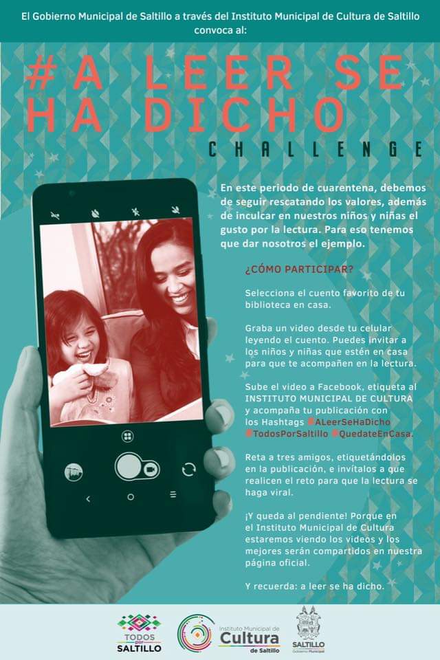 Con el objetivo de fortalecer los valores familiares y el hábito de la lectura, en especial en esta cuarentena, el Gobierno Municipal de Saltillo, a través del Instituto Municipal de Cultura, lanzó el challenge “A leer se ha dicho”, a través de las redes sociales.