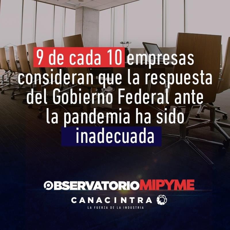 El Observatorio de Micro, Pequeñas y Medianas Empresas de Canacintra, retomó en redes sociales parte de los resultados de su última encuesta, en la que se destaca que nueve de cada diez empresas consideran inadecuado el actuar del Gobierno Federal ante la Pandemia por COVID-19.