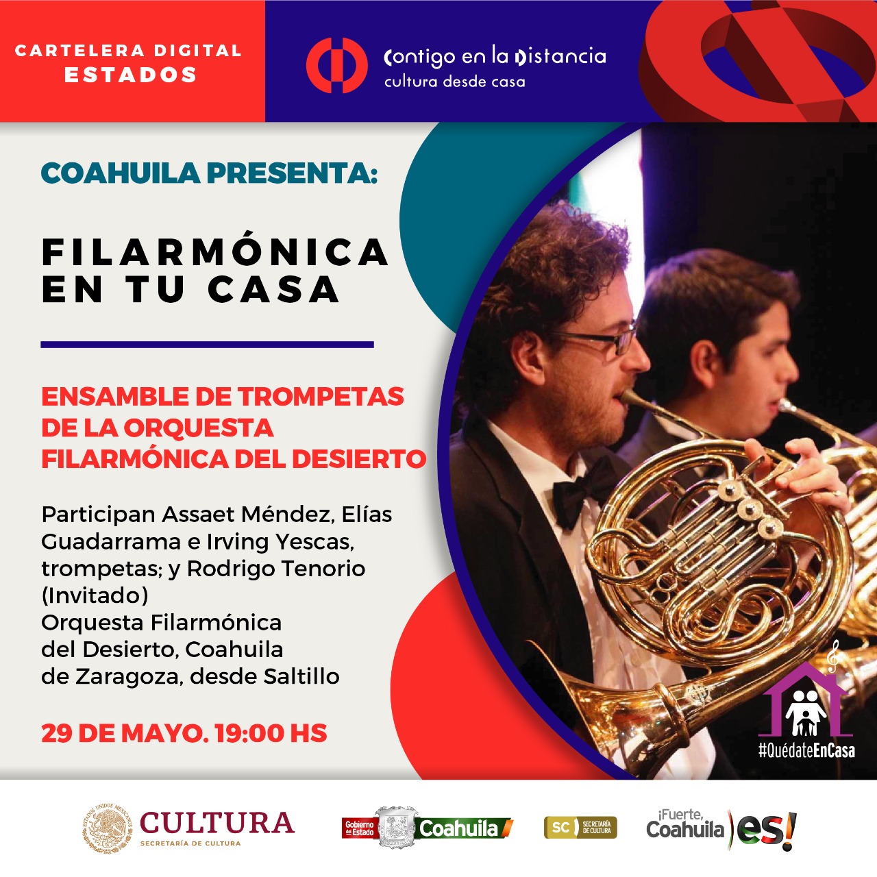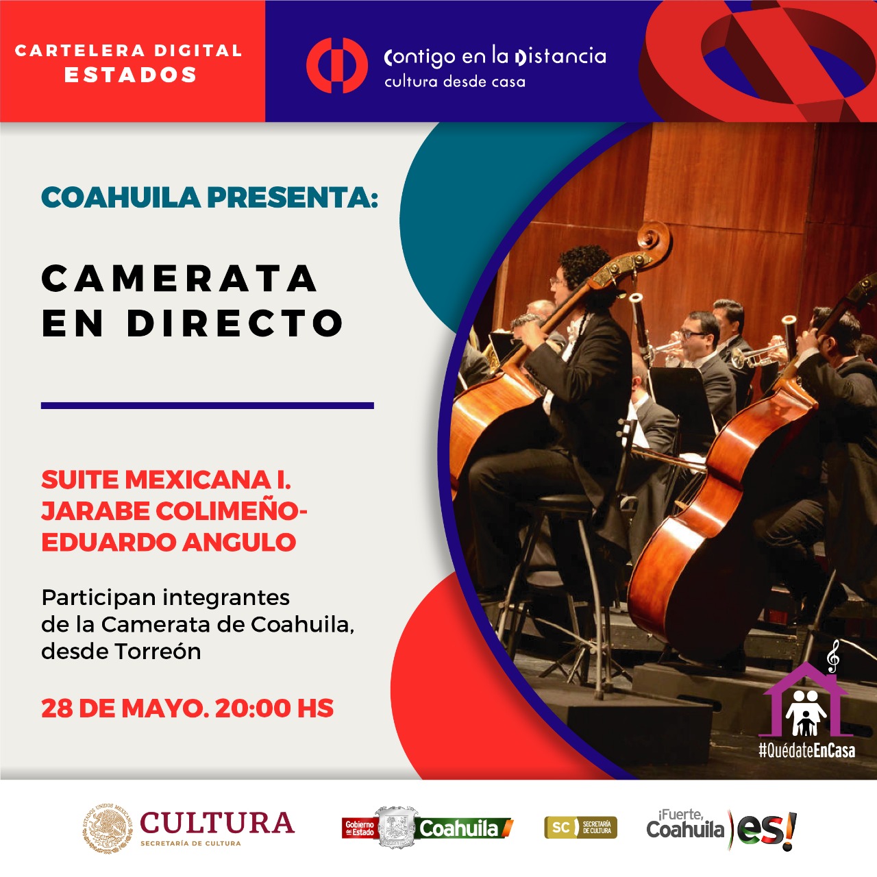 García Camil explicó que en los días siguientes destacan la participación de la Camerata del Estado, que realizará un “en vivo” el día 28 de mayo a las 20:00 horas, con Suite Mexicana I. Jarabe Colimeño; y la Orquesta Filarmónica del Desierto presentará un Ensamble de trompetas de la Orquesta, esto el 29 de mayo a las 19:00 horas.