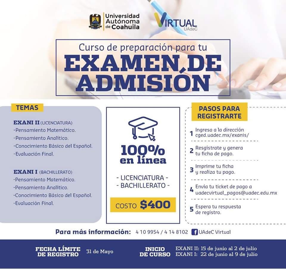 La Universidad Autónoma de Coahuila, a través de la Coordinación General de Educación a Distancia, convoca a los aspirantes que presentarán el examen de admisión para bachillerato y licenciatura semestre agosto-diciembre 2020, a inscribirse al curso virtual de preparación para la prueba de admisión EXANI I y II.