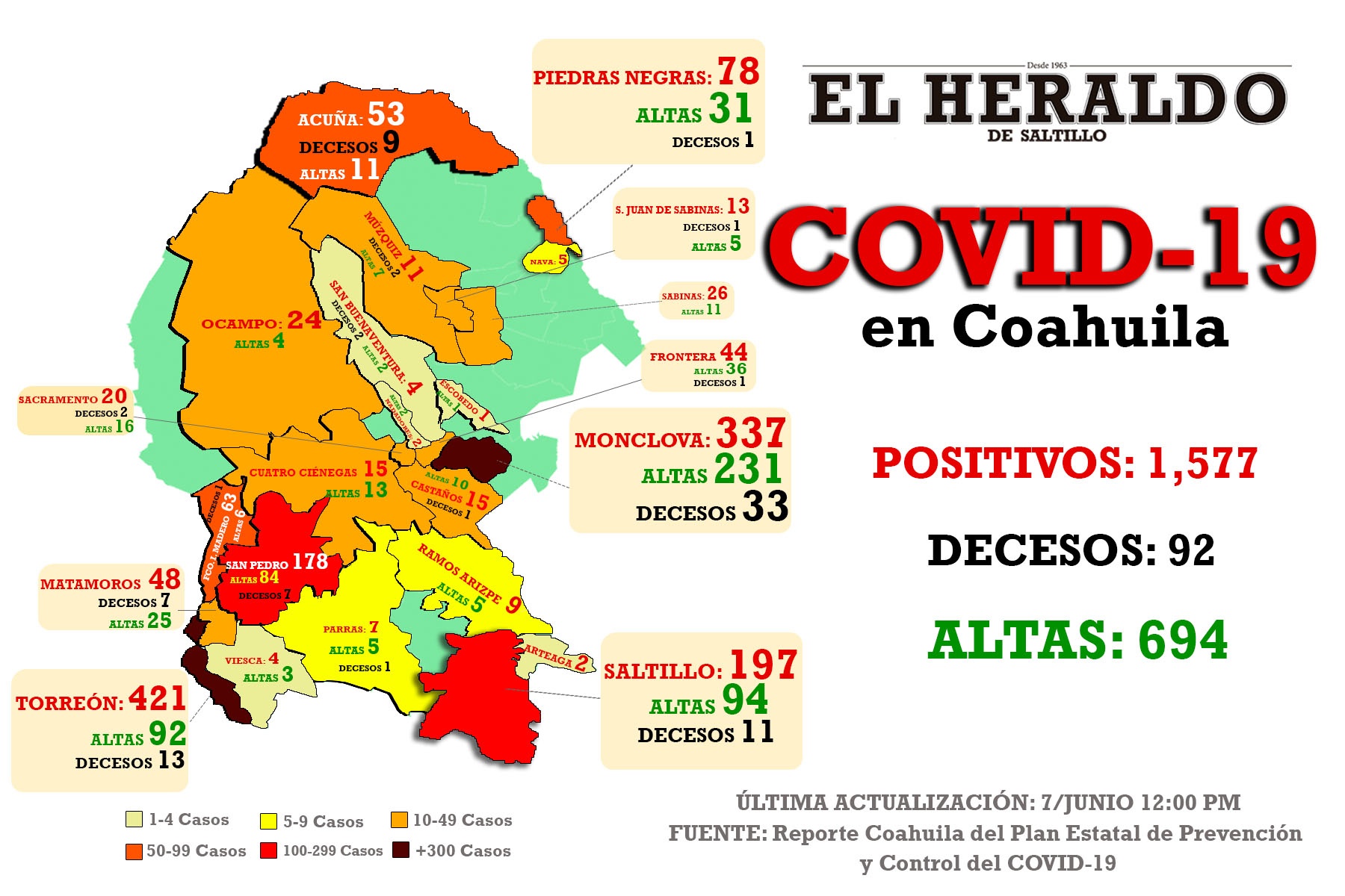 Se contabilizan en Coahuila 1,577 casos detectados -incluidos 92 decesos- distribuidos de la siguiente manera: