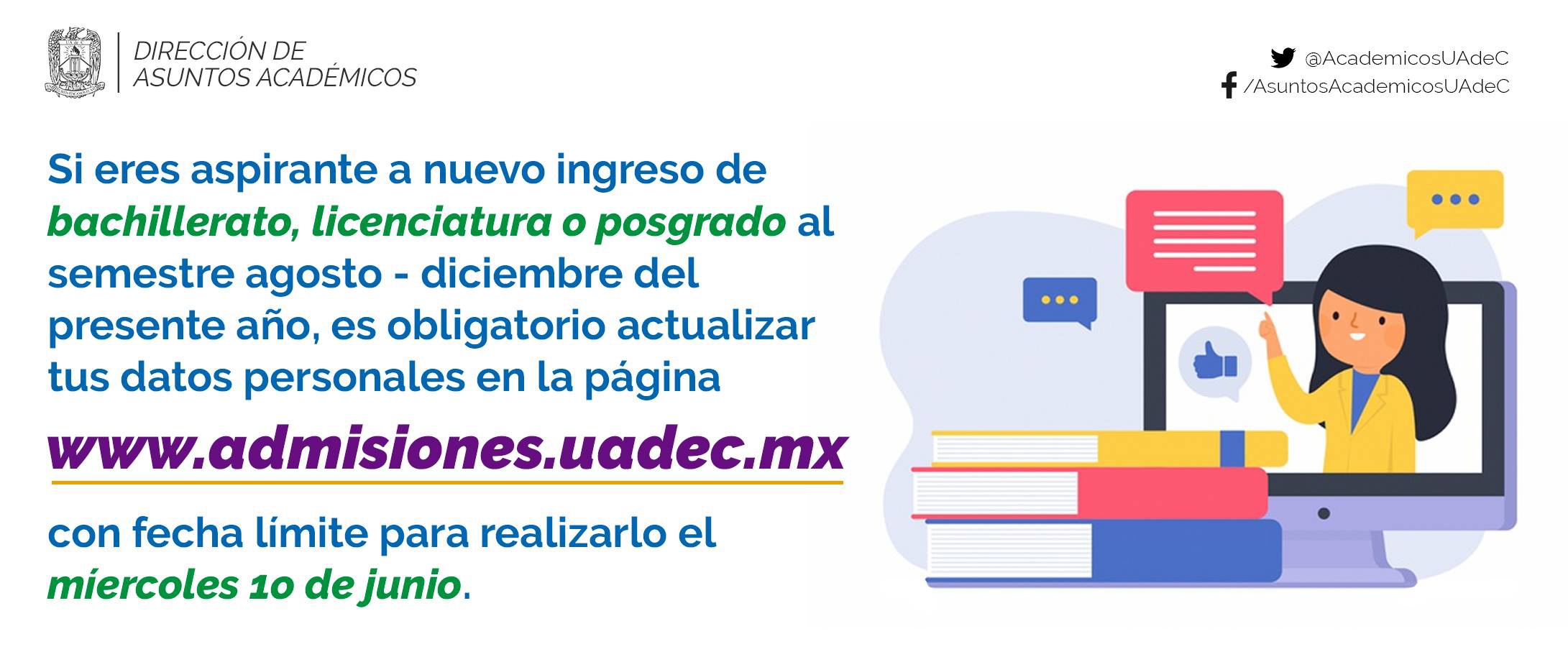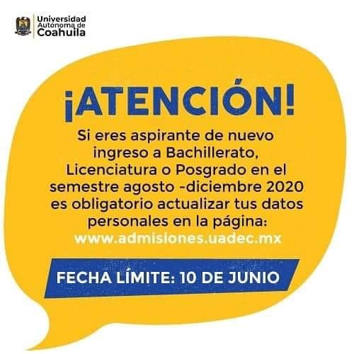 La Universidad Autónoma de Coahuila informa a los aspirantes de nuevo ingreso a bachillerato, licenciatura o posgrado al semestre agosto-diciembre de 2020, que tienen hasta el 10 de junio para realizar su actualización de datos personales en la página www.admisiones.uadec.mx, siendo este un procedimiento obligatorio para presentar el examen de admisión.
