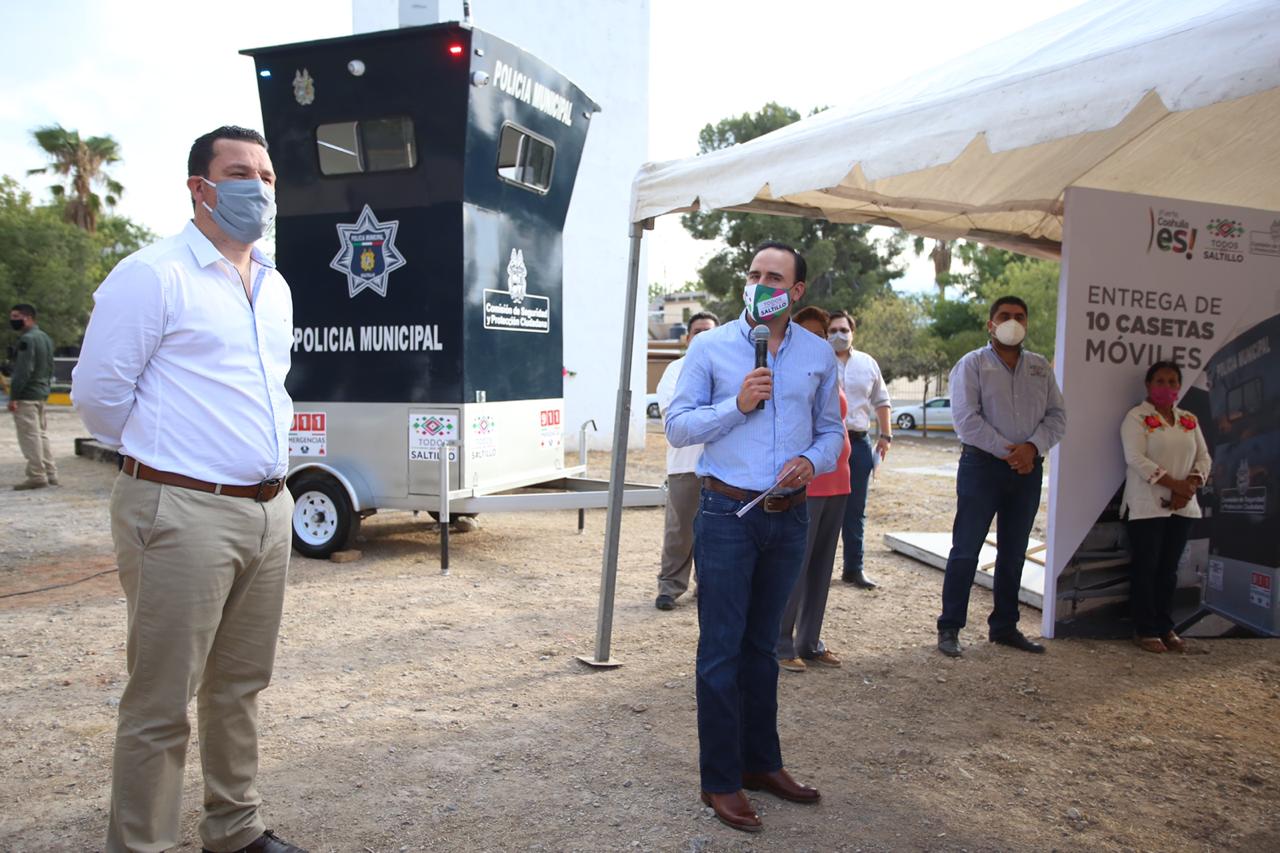 Con todas las medidas preventivas sanitarias, el alcalde Manolo Jiménez Salinas llevó a cabo la entrega de 10 nuevas casetas móviles de la Policía Municipal, con las cuales suman ya 32 en total para el reforzamiento de la seguridad de la población saltillense.
