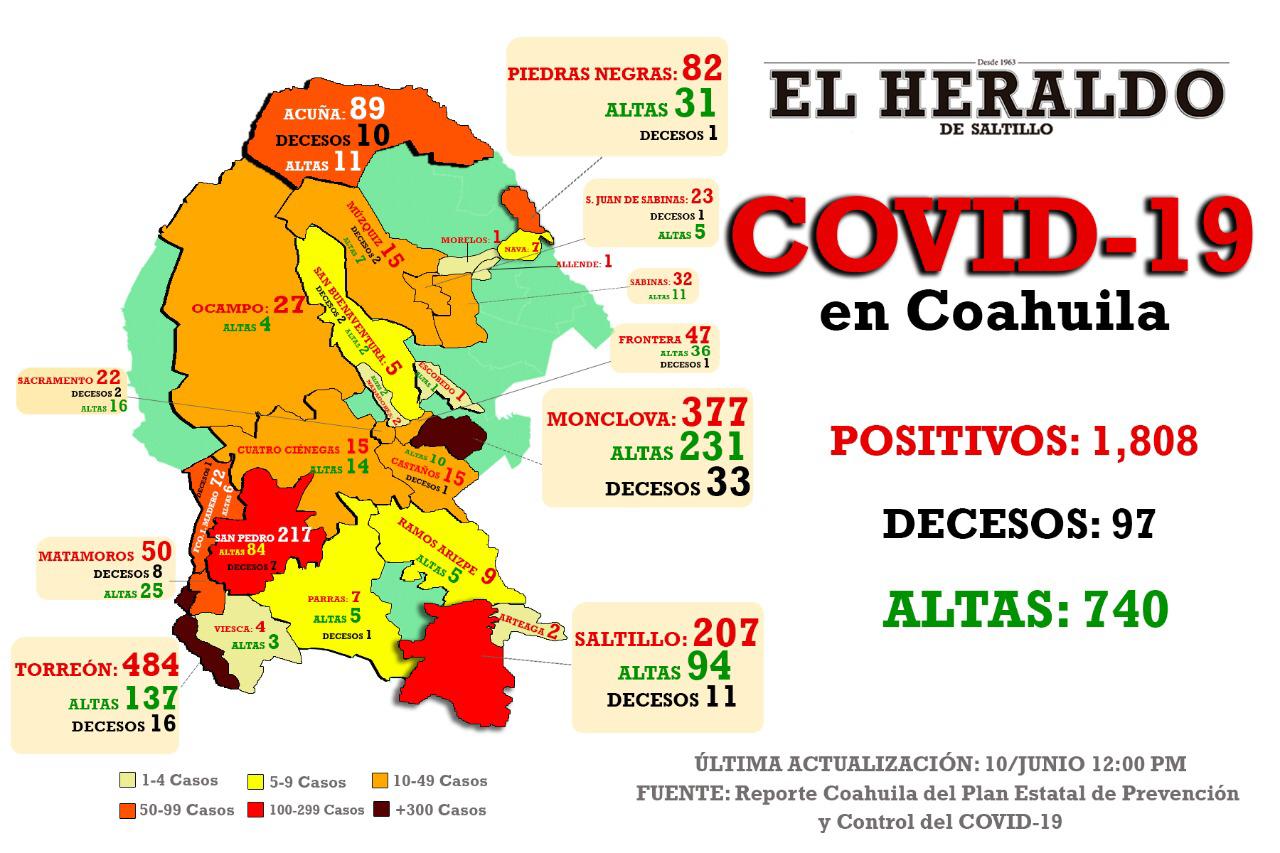 Se contabilizan en Coahuila en total 1,808 casos detectados -incluidos 97 decesos- distribuidos de la siguiente manera: