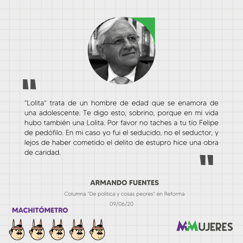 Por hacer apología de un abuso sexual contra una menor de edad en un relato en su espacio editorial semanal en Grupo Reforma, ‘De Política y Cosas Peores’, el columnista Armando Furentes, ‘Catón’, registró 5 machitos en el #Machitómetro de Mujeres+Mujeres.