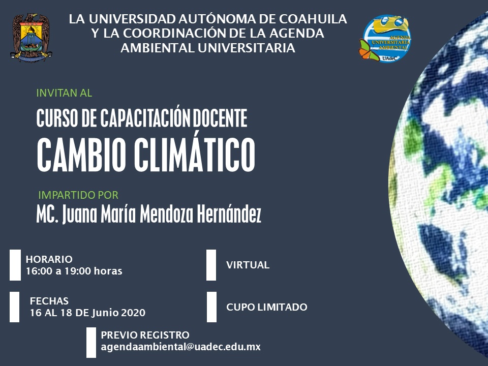 La Coordinación de Agenda Ambiental Universitaria de la Universidad Autónoma de Coahuila convoca a los docentes de la institución a tomar el curso de capacitación docente “Cambio Climático” que se llevará a cabo del 16 al 18 de junio de 2020 de manera virtual.