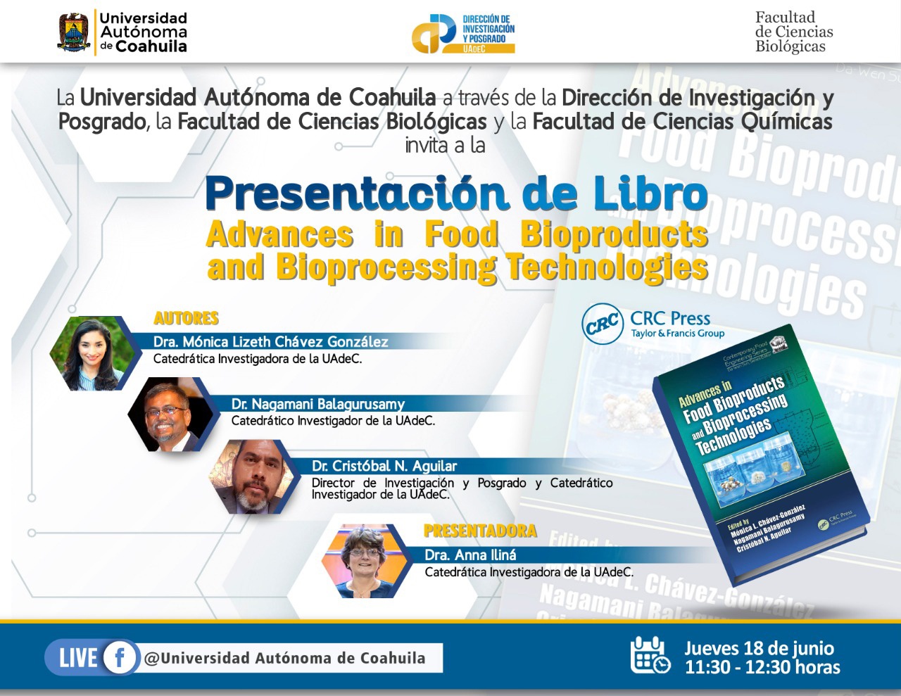 La Universidad Autónoma de Coahuila a través de la Dirección de Investigación y Posgrado, invitan a la presentación del libro “Advances in Food Bioproducts and Bioprocessing Technologies” el jueves 18 de junio a las 11:30 horas por trasmisión en vivo.