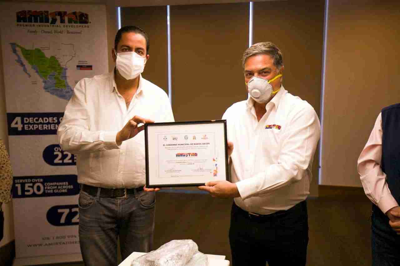 El emprsario Jesús María Ramón, presidente del Grupo Amistad, hizo entrega este miércoles de un respirador artificial al alcalde de Ramos Arizpe, José María Morales Padilla, el cual estará siendo operado por personal médico del Hospital Rural número 33, mejor conocido como “El Ixtlero” para fortalecer el equipamiento de ese nosocomio para la atención de pacientes del COVID-19.
