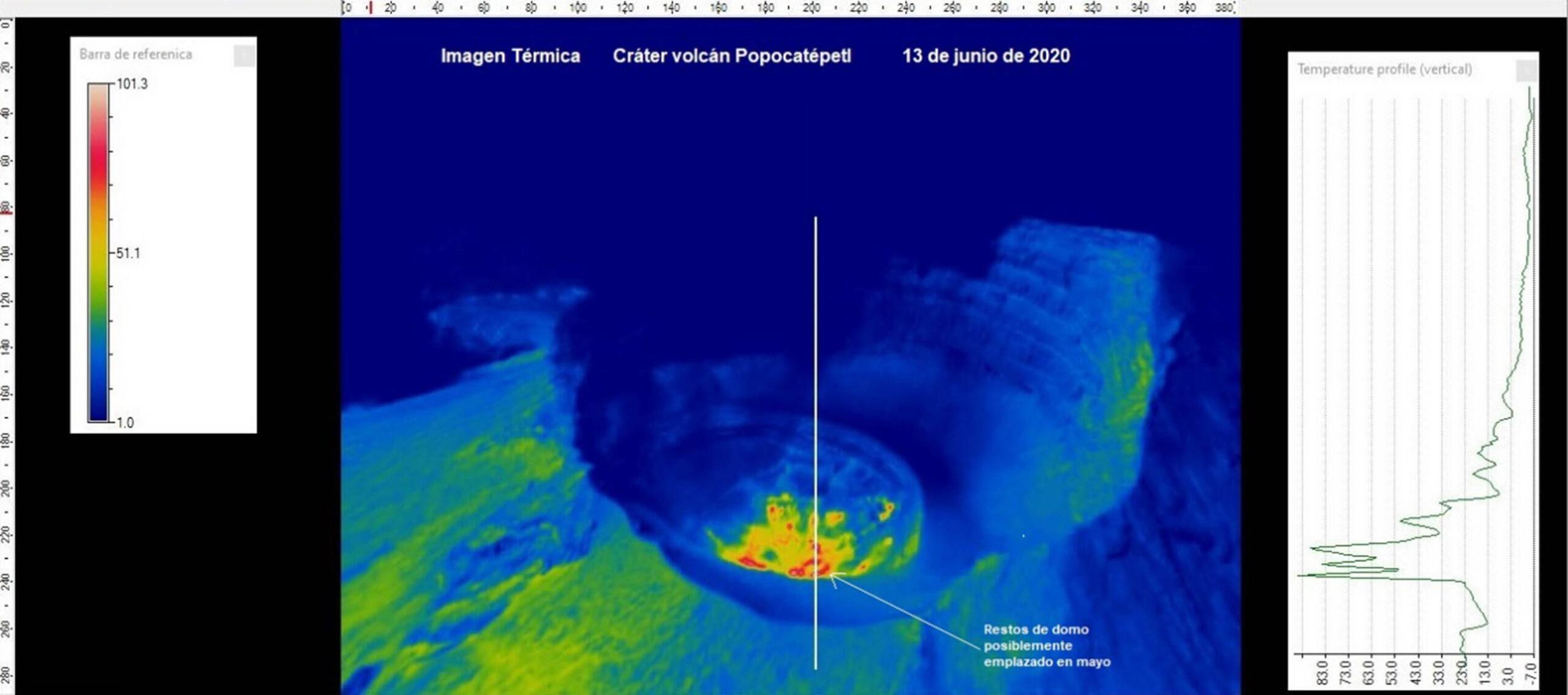 El diámetro del cráter interior se encontró sin cambio con respecto al vuelo anterior, realizado en febrero 2020. Se pudo identificar en su fondo la presencia de bloques remanentes de un domo chiquito, emplazado probablemente a mediados de mayo.
