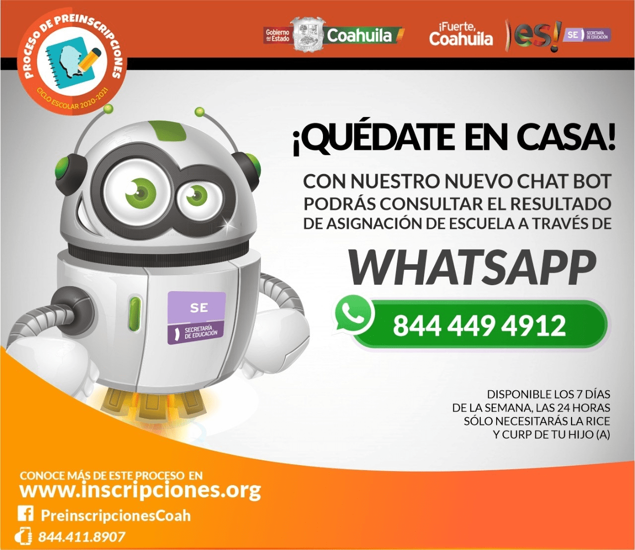 El Secretario de Educación en Coahuila, Higinio González Calderón, informó que el CHATBOT fue diseñado para que los padres y madres de familia consulten y/o confirmen la escuela asignada para los alumnos de nuevo ingreso, entre otras dudas.
