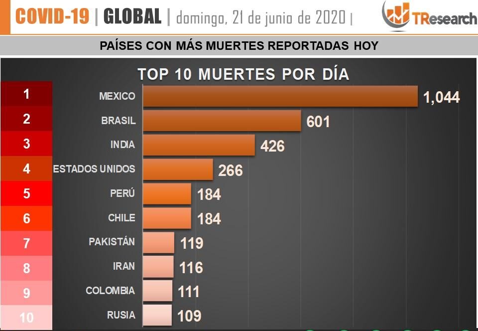 México tuvo este domingo su segundo día con mayor número de muertes registradas por COVID-19 desde que inició la epidemia, con mil 44, además, este domingo ocupó el primer lugar a nivel mundial en decesos por día, superando casi por el doble a Brasil que registró 601 y cuadriplicando a Estados Unidos que reportó 426.