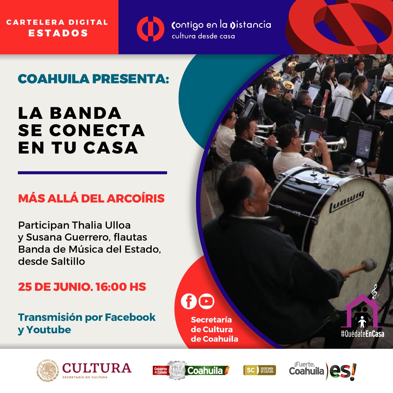 –      Banda de Música del Estado llegará a los hogares con “Más allá del arcoíris”, con la participación de Thalía Ulloa y Susana Guerrero. Vía Facebook y YouTube, el día 25 de junio a las 16:00 horas.