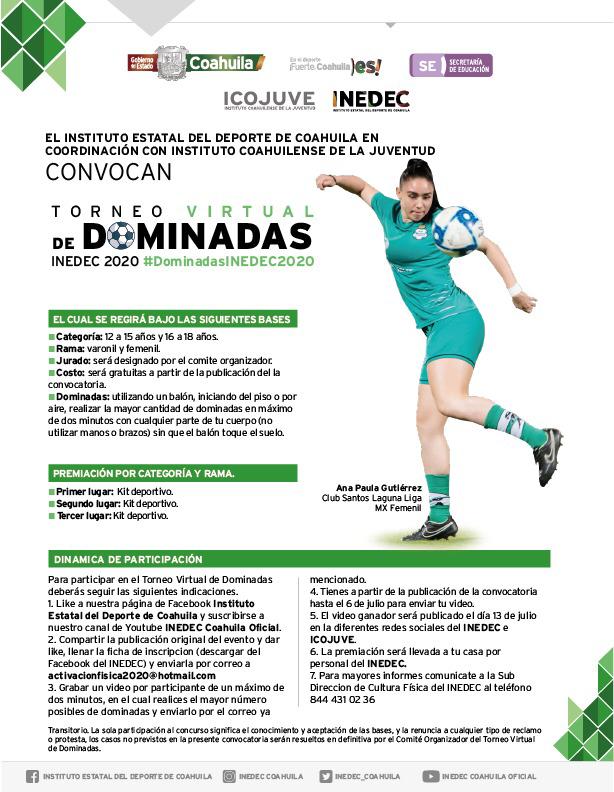 Con el objetivo de mantener activados físicamente a nuestras niñas, niños y jóvenes, y que desde casa se ejerciten de manera lúdica y entretenida, el Instituto Estatal del Deporte de Coahuila (INEDEC) y el Instituto Coahuilense de la Juventud (ICOJUVE) convocan al Torneo Virtual de Dominadas.