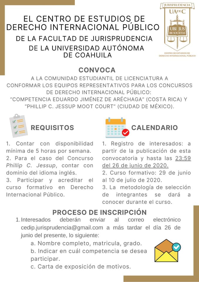 La Facultad de Jurisprudencia de la Universidad Autónoma de Coahuila a través del Centro de Estudios de Derecho Internacional Público convoca a su comunidad estudiantil que cursa licenciatura a conformar los equipos representativos para los concursos de Derecho Internacional Público “Competencia Eduardo Jiménez de Aréchaga” (Costa Rica) y “Phillip C. Jessup Moot Court” (Ciudad de México).