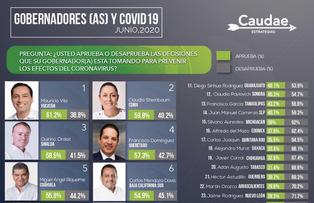Figuran en primer lugar el gobernador de Yucatán Mauricio Vila con un nivel de aprobación del 61.2 por ciento, seguido por la Jefa de Gobierno de la Ciudad de México Claudia Sheinbaum con 59.8 por ciento; el gobernador de Sinaloa Quirino Ordaz quien alcanzó el 58.5 por ciento.