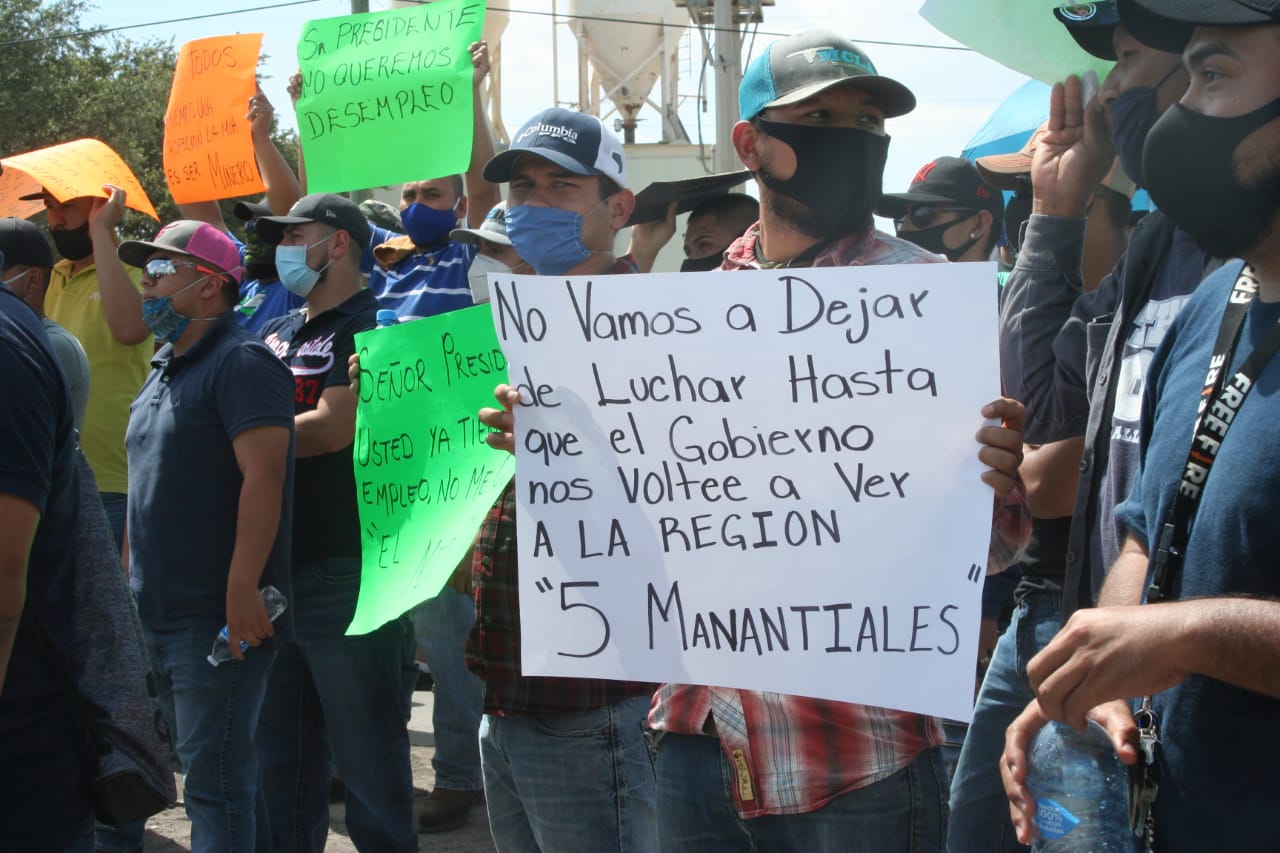 “No vamos a dejar de luchar hasta que el Gobierno nos voltee a ver a la Región 5 Manantiales… Sr Presidente no queremos desempleo… Señor presidente, usted ya tiene empleo, no me quite el mío”, señalaban las pancartas de los manifestantes.