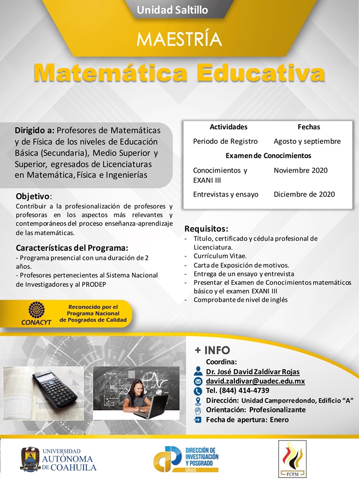 La Universidad Autónoma de Coahuila, a través de la Facultad de Ciencias Físico Matemáticas, ofrece la maestría en Matemática Educativa, reconocida dentro del Programa Nacional de Posgrados de Calidad de CONACYT.