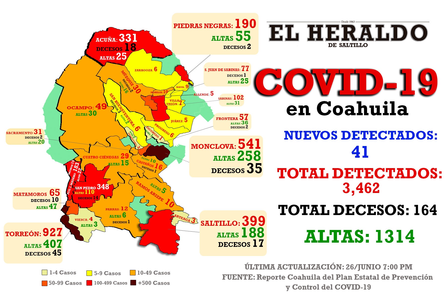 Se contabilizan en Coahuila en total 3 mil 462 casos -incluidos 164 decesos- distribuidos de la siguiente manera: