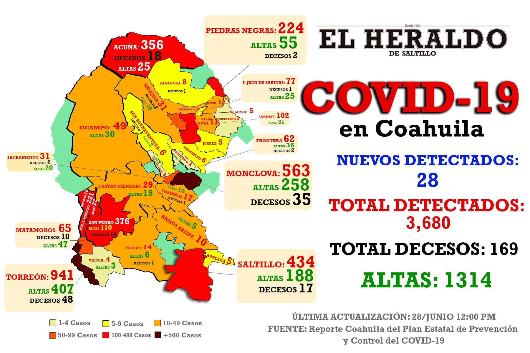 Se contabilizan en Coahuila en total 3 mil 680 casos registrados -incluidos 169 decesos- distribuidos de la siguiente manera: