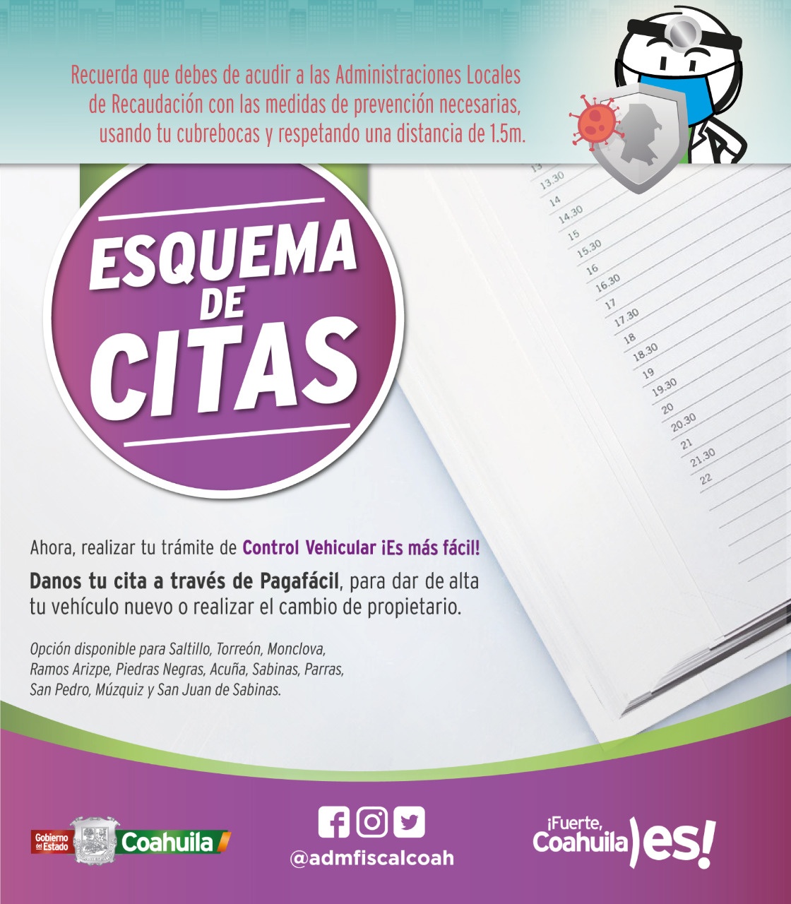 Concluyó indicando que este esquema de citas está disponible para Saltillo, Torreón, Monclova, Ramos Arizpe, Piedras Negras, Acuña, Sabinas, Parras, San Pedro, Múzquiz y San Juan de Sabinas. (EL HERALDO)