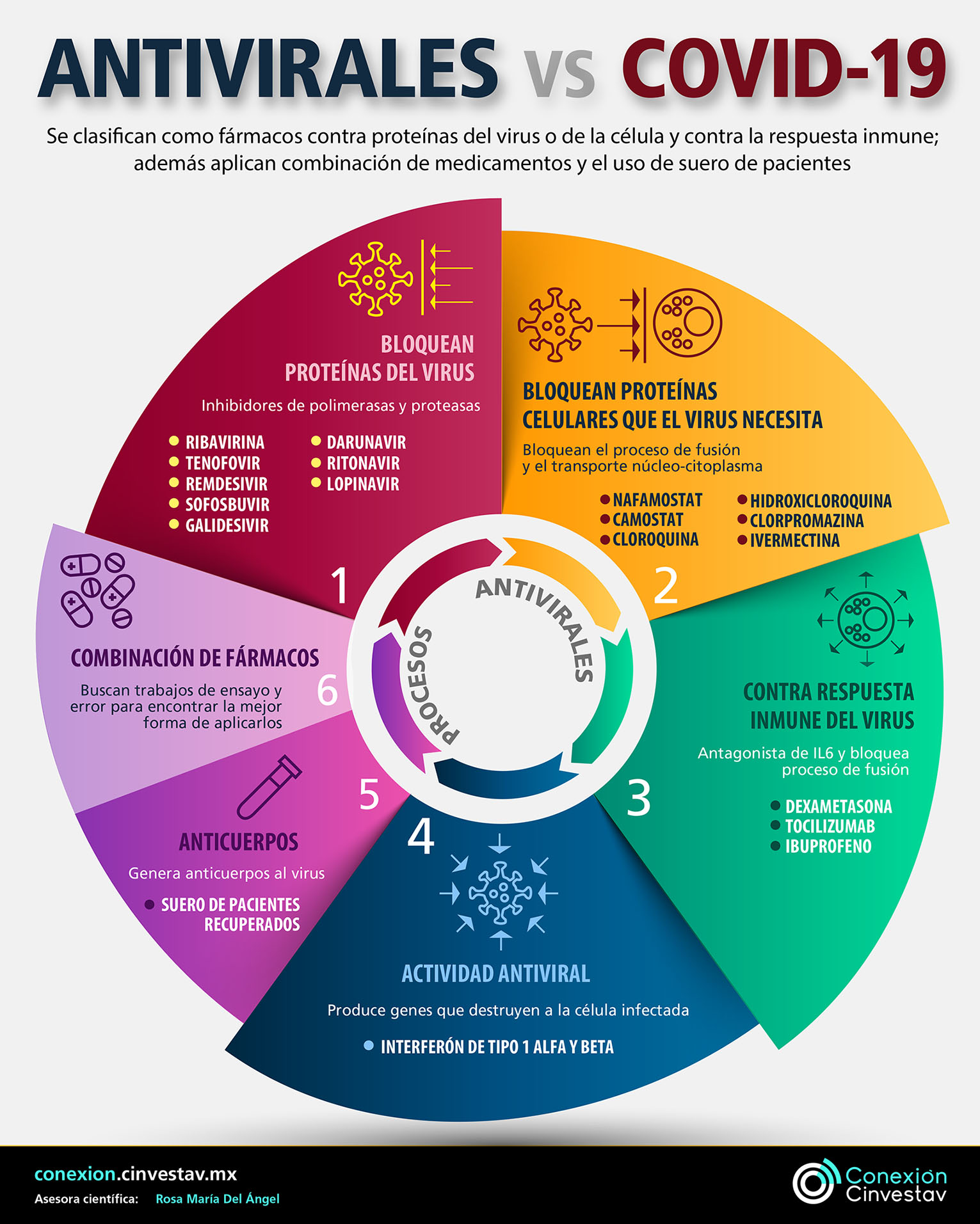 Del Ángel Núñez ubicó tres tipos de antivirales y dos estrategias contra el SARS-CoV-2 que dependiendo de su acción contra el virus se clasifican como fármacos contra las proteínas del virus, contra proteínas de la célula y contra la respuesta inmune; de las estrategias se identifican terapias que combinan varios medicamentos y el uso de suero de pacientes recuperados.