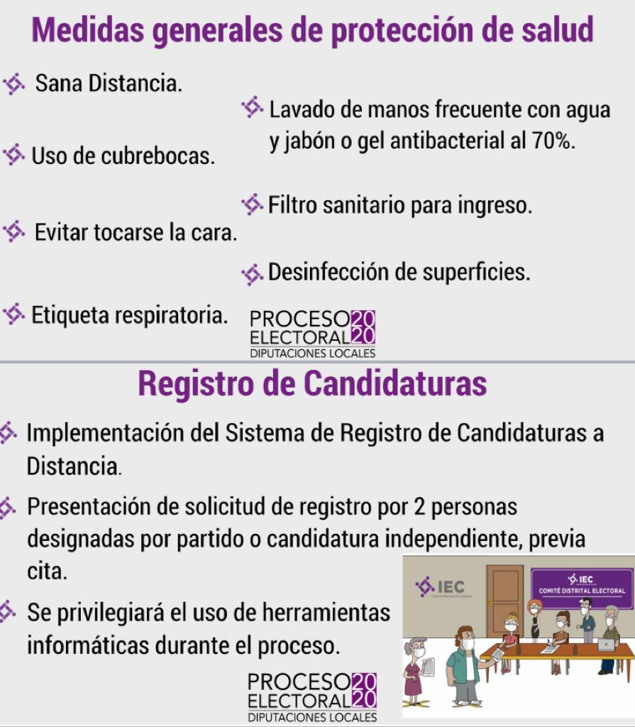 El registro de candidaturas quedó a dos semanas de llevarse a cabo, cuando se dispuso la suspensión de actividades por lo que se diseñó un sistema en línea con tutoriales para concretarlo; y a la entrega de documentación que se hace de manera física en los comités distritales dos semanas después de que se reanude el proceso, deberán ir sólo dos personas por partido político.